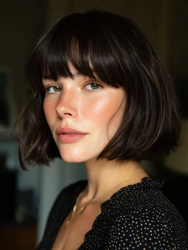 A razor cut bob with curtain bangs softens the forehead and blends fringe into cheek-length pieces. The razor keeps everything airy, preventing the bangs from feeling heavy or stiff. Subtle crown layering adds bounce while maintaining the bob’s clean outline.