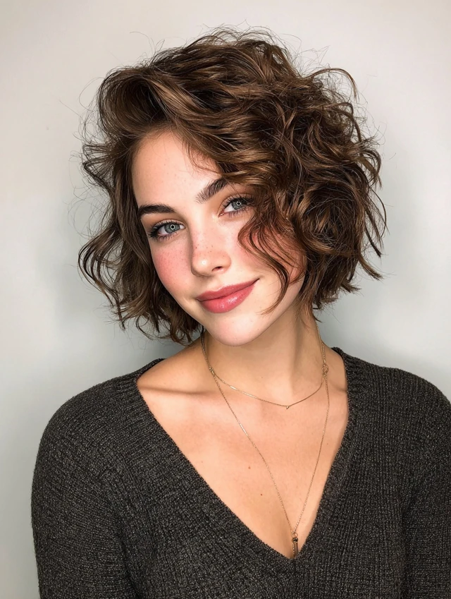 Side-swept bangs integrate naturally with curls and create a soft, flattering frame.