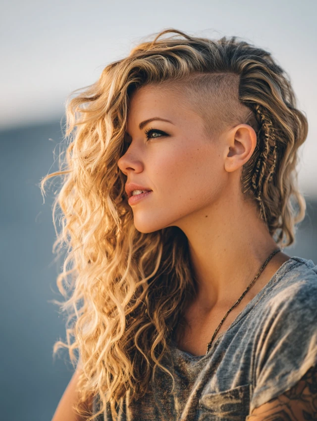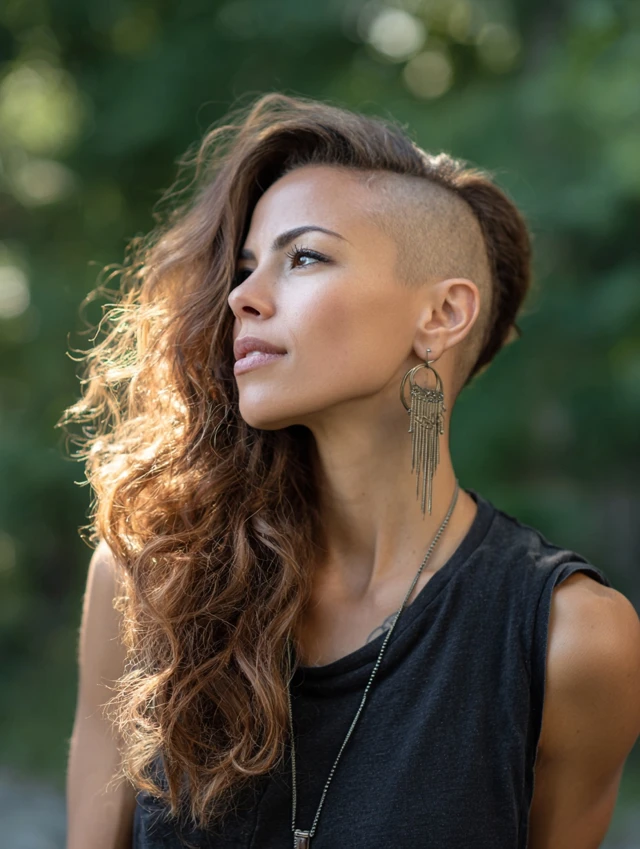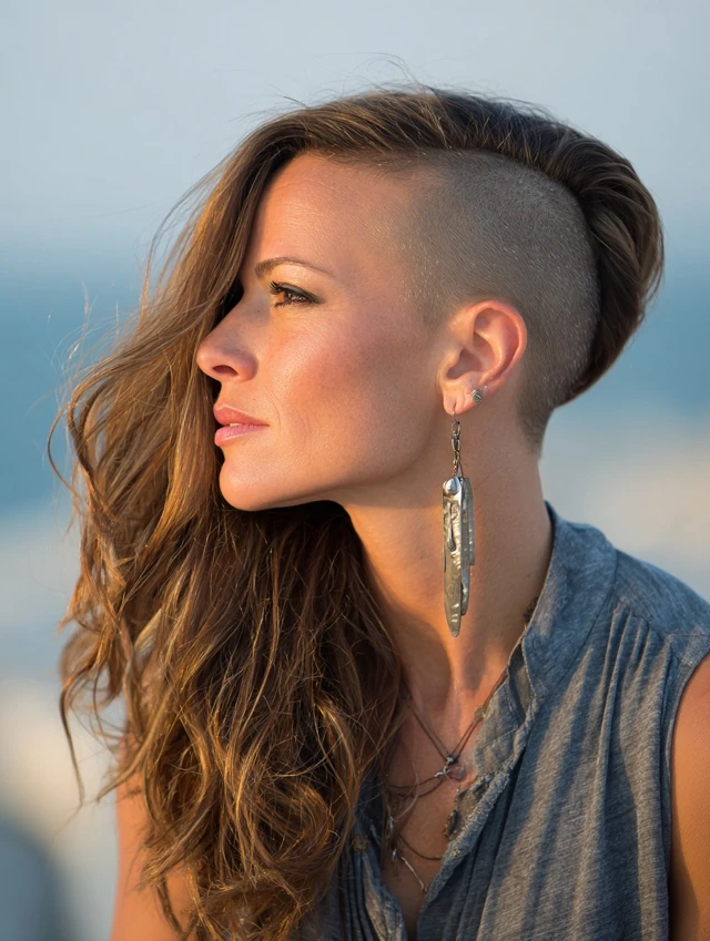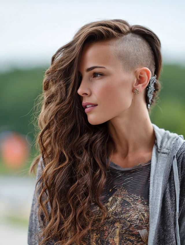 Long waves paired with side shaved hairstyles keep softness on top while adding attitude underneath. The flowing length offsets the clipped section, which prevents the look from feeling harsh. Loose waves soften facial angles and add movement that makes the contrast feel intentional instead of extreme.