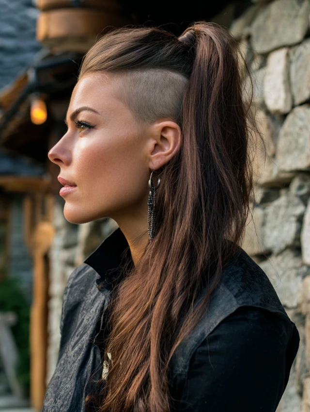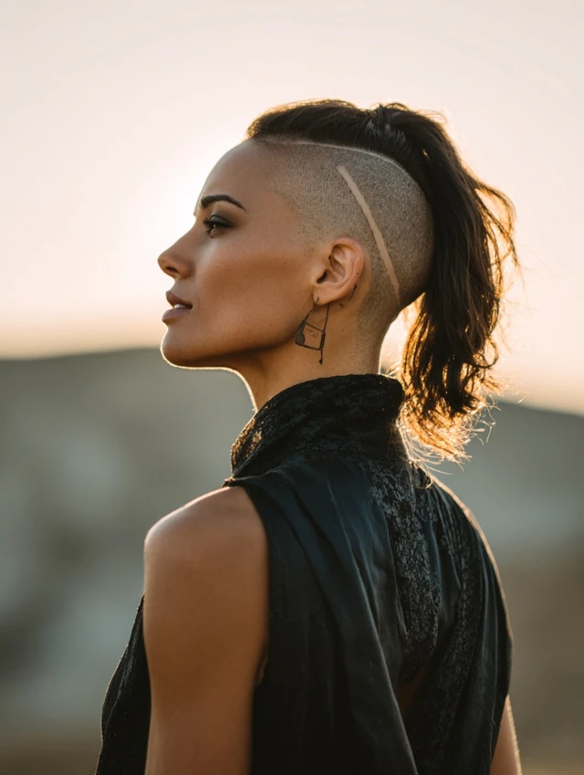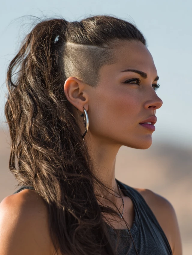A side shaved ponytail keeps drama hidden until hair pulls back. The long section stays smooth or wavy, while the shaved panel appears when you tie everything up. That reveal effect gives versatility and keeps the look adaptable across different settings.