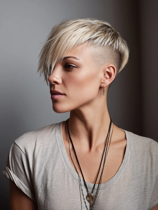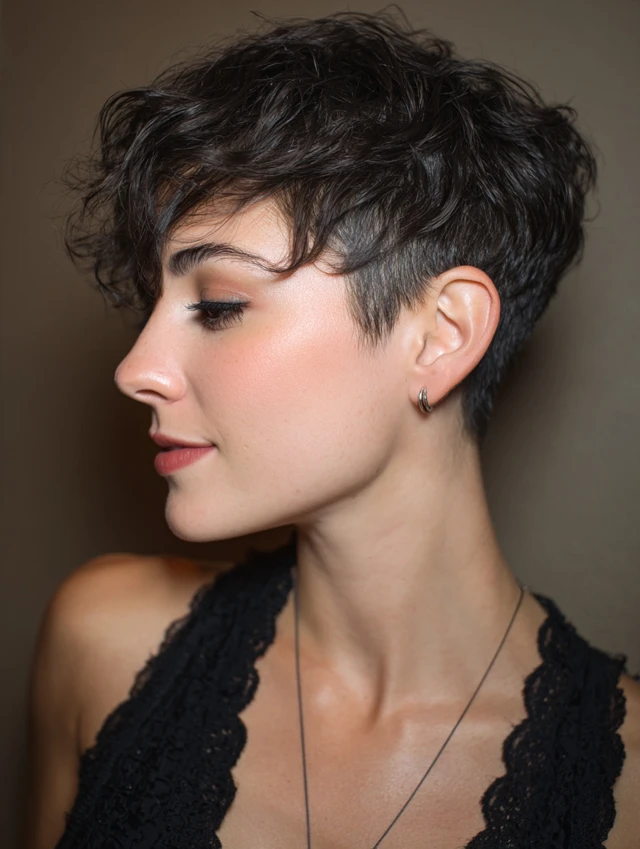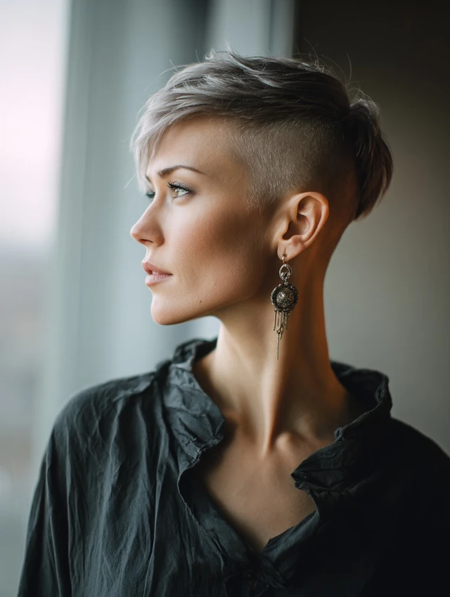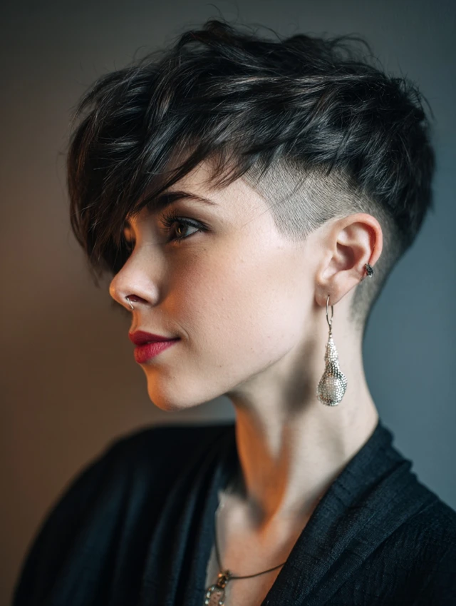 A pixie cut with one side shaved keeps the top longer while removing weight near the temple. The contrast sharpens cheekbones and adds structure without overwhelming smaller features. Textured layers on top create lift, which prevents the style from looking flat or severe.