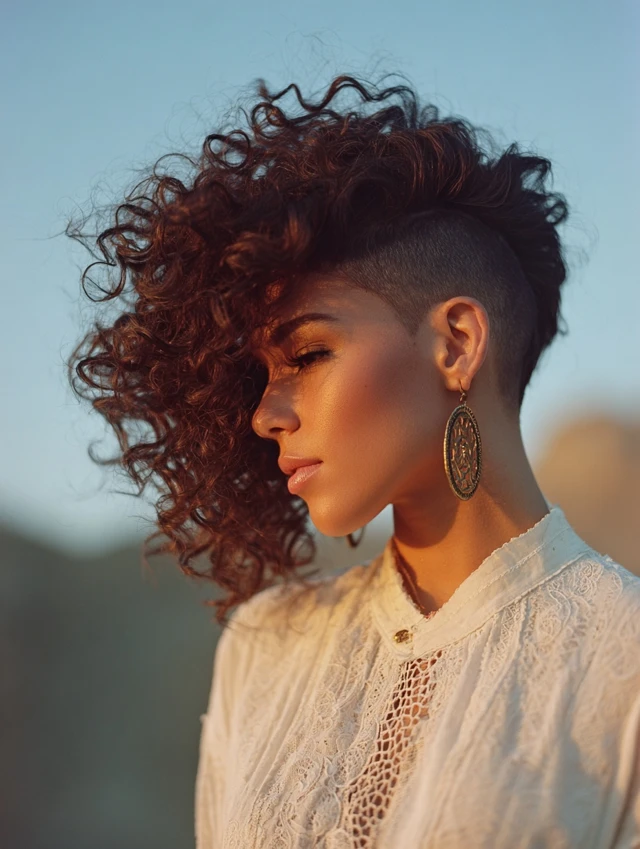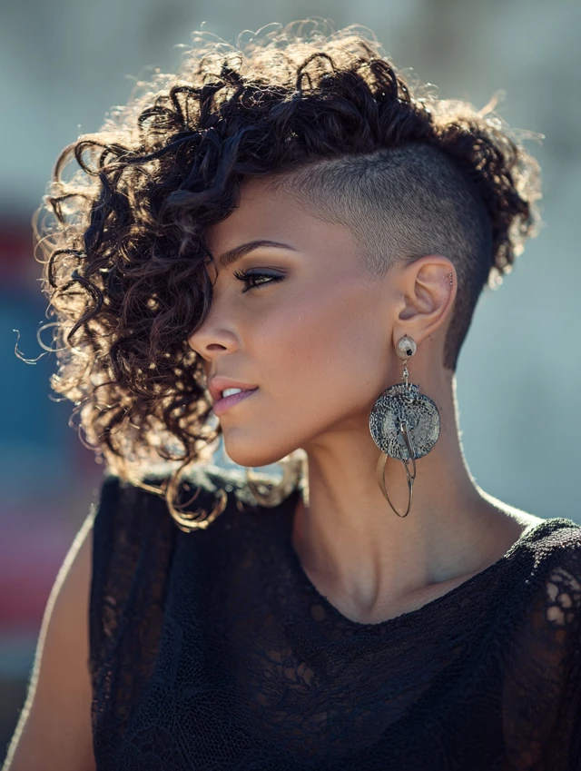 A curly side shaved hairstyle focuses height and texture toward the crown while clearing bulk near the temples. Natural curls lift the longer side, keeping the silhouette rounded and energetic. The shaved panel stops the style from feeling heavy or crowded around the face.