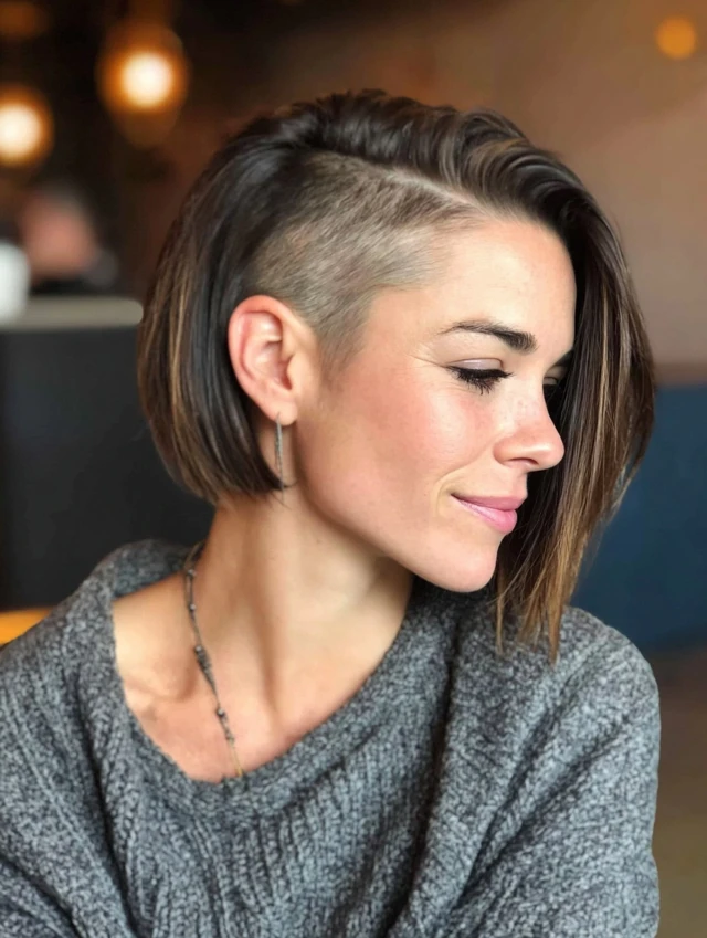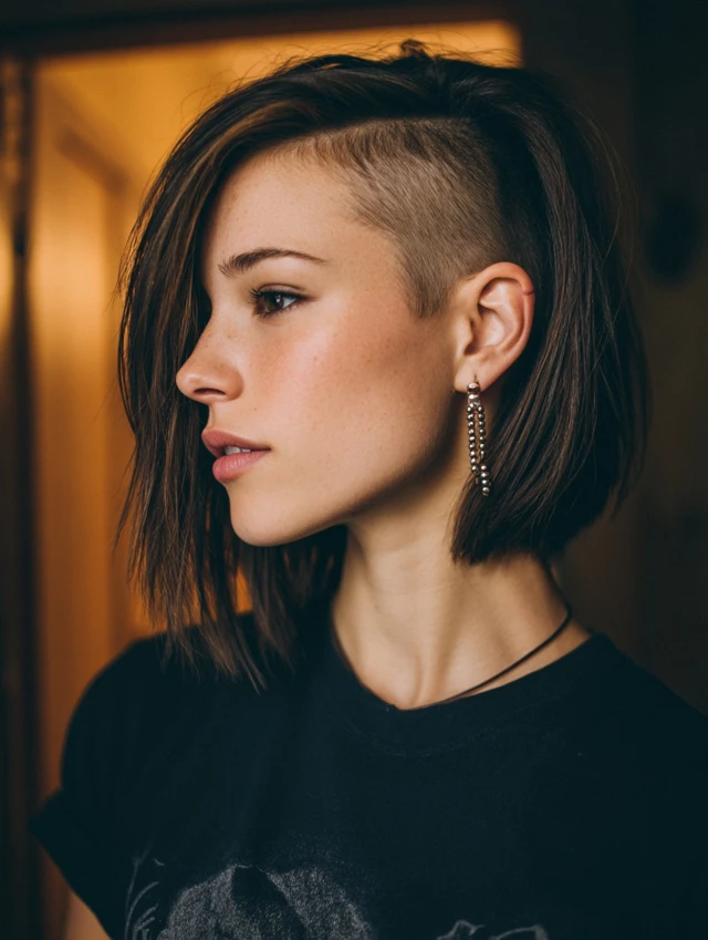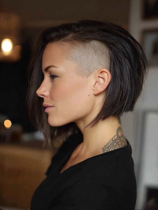 A sleek lob combined with side shaved hairstyles delivers polish with a rebellious twist. The straight length frames the face cleanly, while the shaved strip adds surprise when hair tucks behind the ear. That mix keeps the look modern rather than overly dramatic.