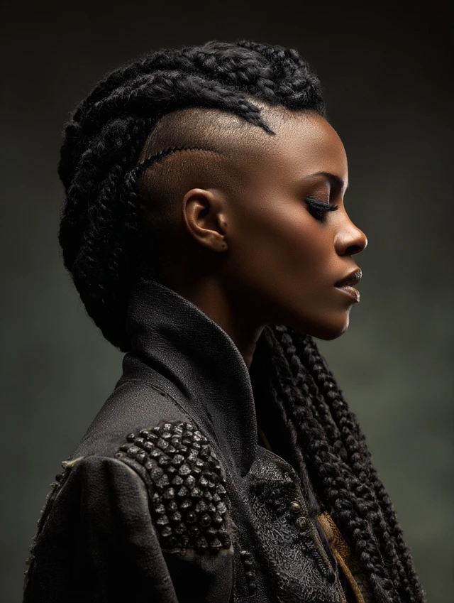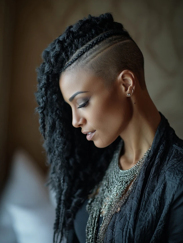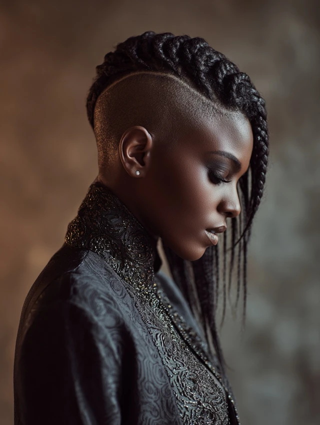A braided side shaved hairstyle mixes pattern with contrast by running cornrows or tight plaits along the clipped section. The braids add detail while protecting hair growth near the scalp. Long lengths on the opposite side keep the silhouette balanced and striking.