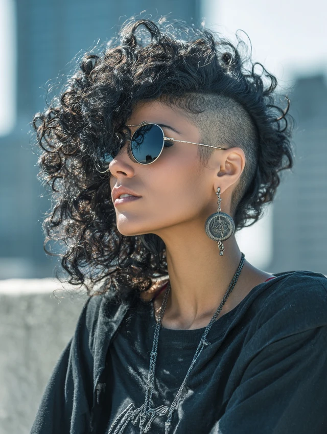 This version works best for medium to thick hair with natural wave or curl. Styling stays simple using mousse and a diffuser. It fits creative workplaces, concerts, and weekends out. You can flip the part to hide the shave when needed.