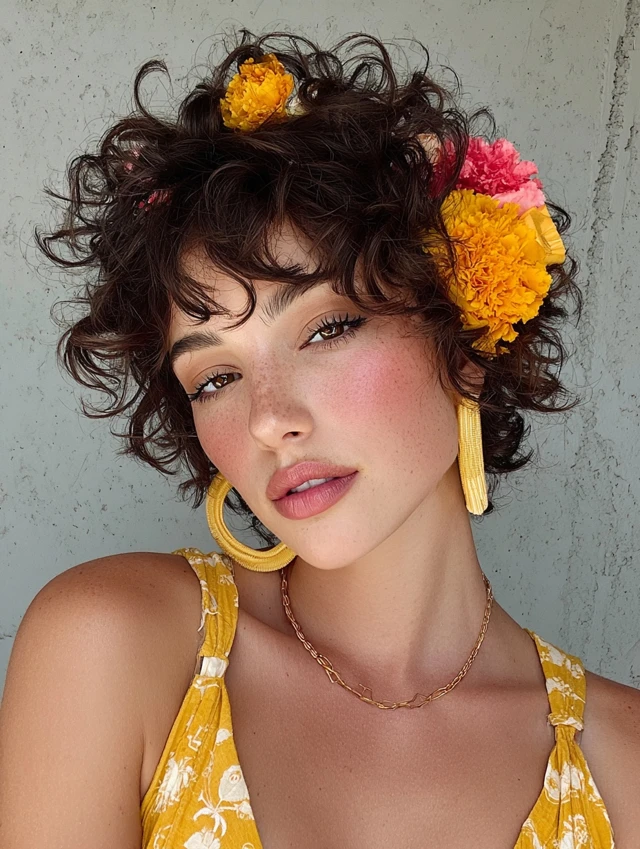2. Curly Pixie with Floral Accessories
