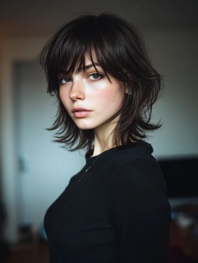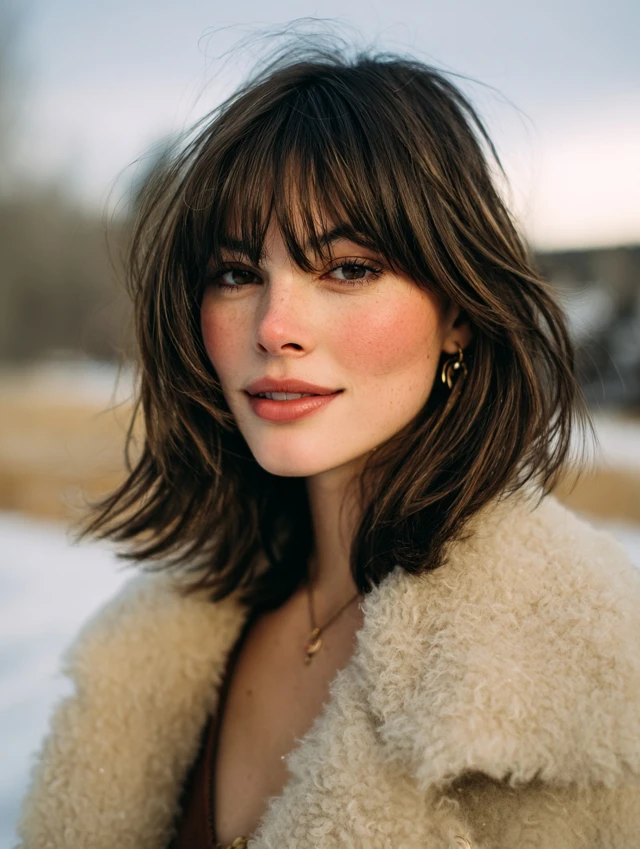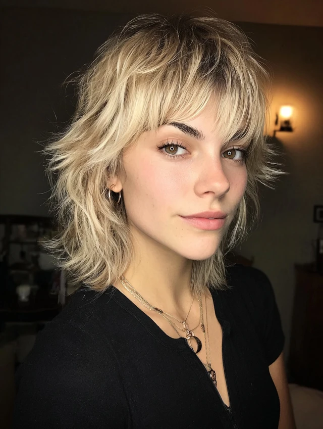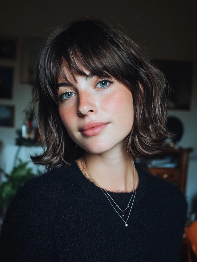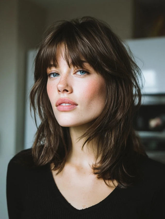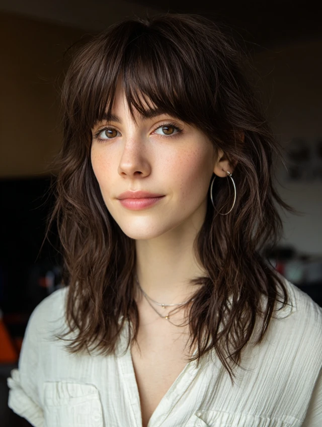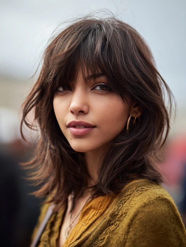 A collarbone-length wolf cut with soft fringe balances dramatic layering with everyday wearability. The bangs skim the brows and blend into cheek-length pieces, while stacked crown layers add volume. Feathered ends stop the shoulders from feeling bulky.