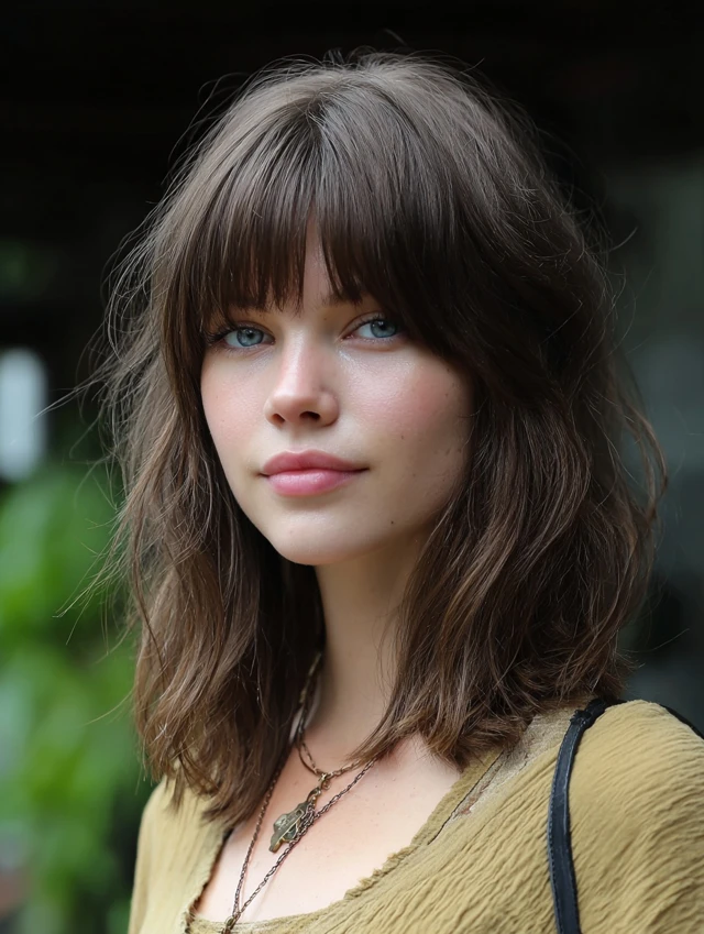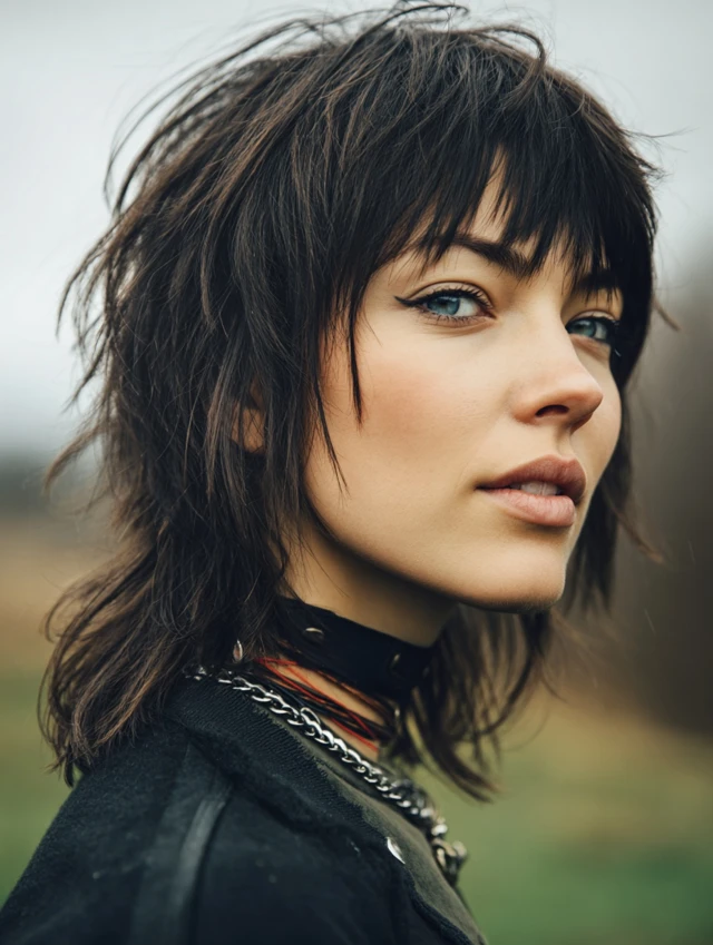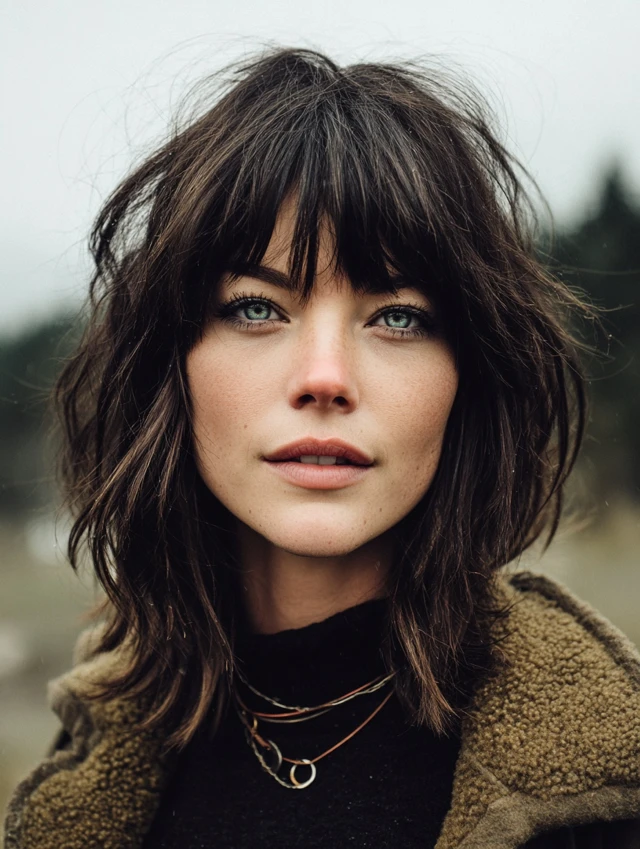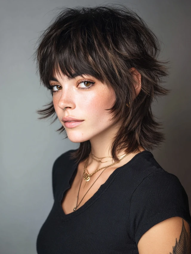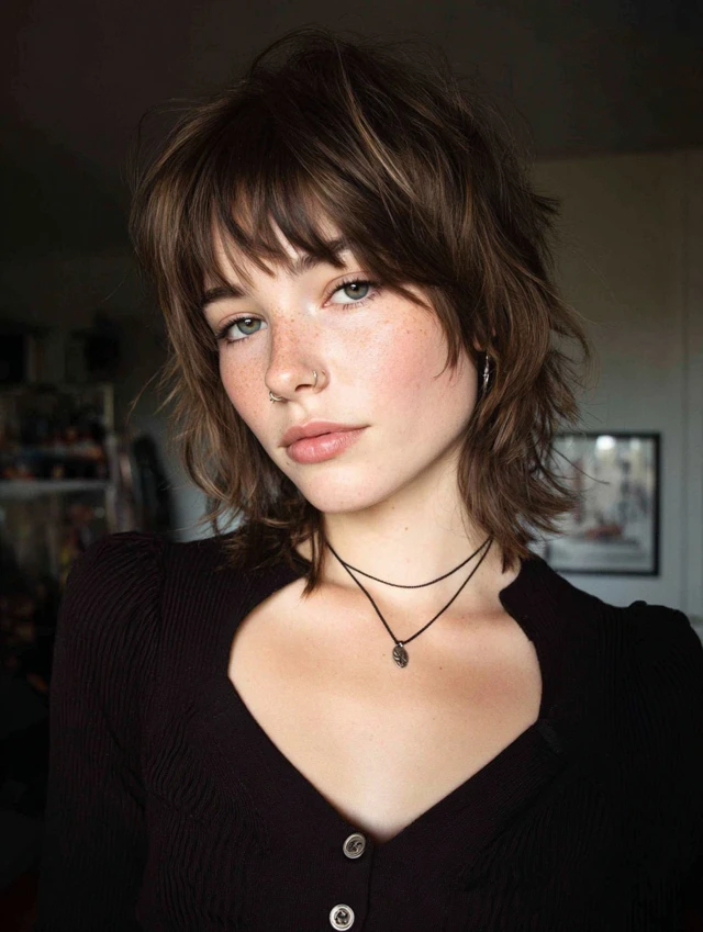 A shaggy wolf cut with choppy bangs leans into broken layers and uneven fringe for a rebellious finish. The crown keeps lift, the sides stay wispy, and the ends flow loosely instead of forming a heavy line. The bangs add attitude without hiding features.