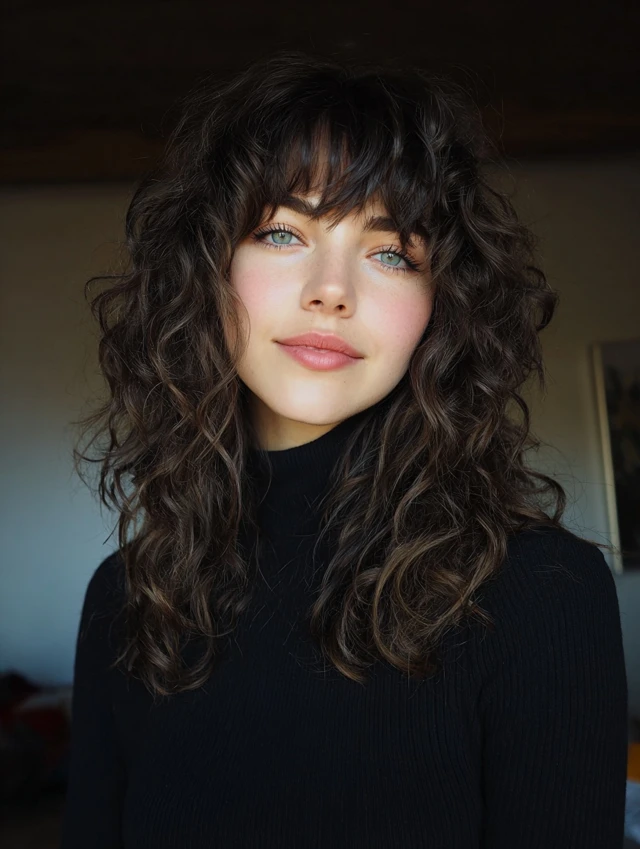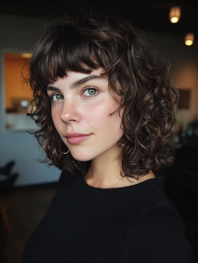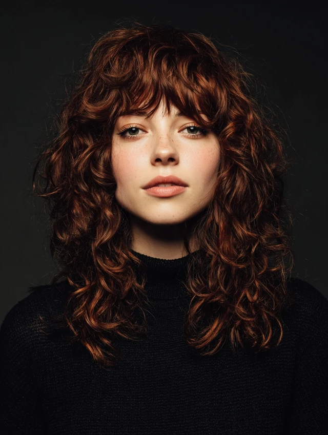 A curly wolf cut with bangs shapes volume through rounded crown layers while letting longer curls fall freely behind. The fringe usually stays soft and broken instead of blunt, keeping the face open and balanced. This structure prevents curls from piling up at the sides.