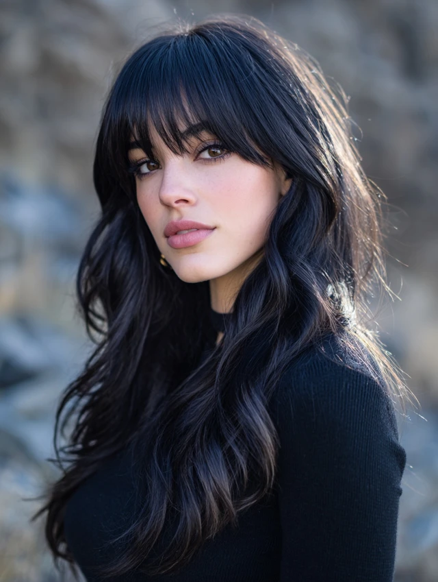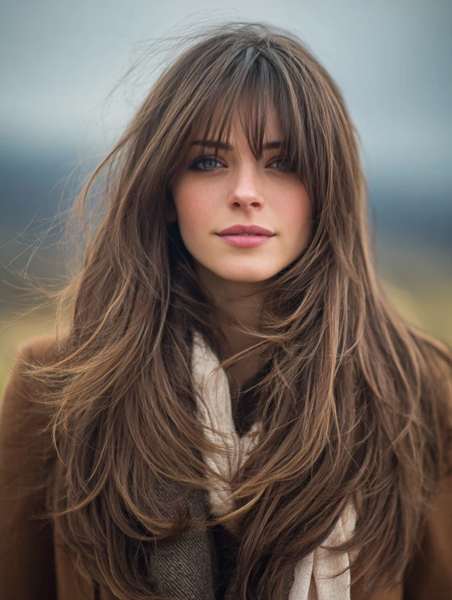 A long wolf cut with blended fringe preserves length while breaking up weight through staggered layers. The bangs flow into face-framing pieces instead of stopping sharply, which keeps everything cohesive. Feathered ends prevent the back from looking heavy.