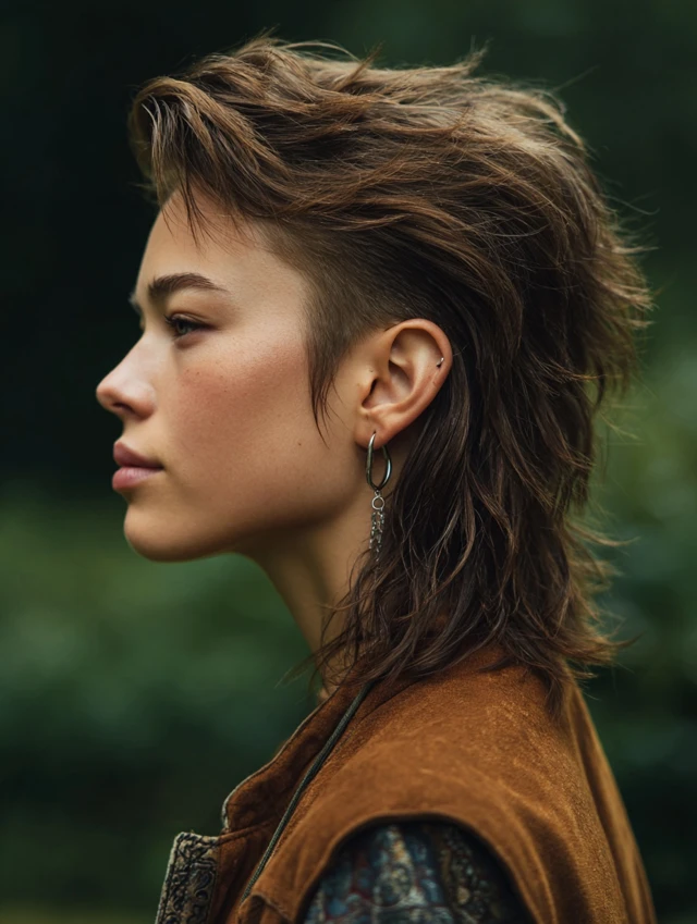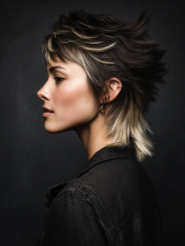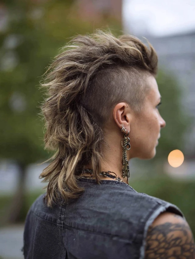 A high-fade mullet removes most bulk from the sides and temples, creating bold contrast with the longer back. The sharp transition pushes attention upward to the crown and fringe, giving the cut a dramatic, modern edge. Textured layers prevent the top from looking flat.