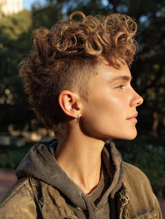 A curly faded mullet shapes volume through rounded crown layers while tapering the sides cleanly. The curls stay loose and defined instead of ballooning outward. The back keeps length but looks intentional rather than wild.