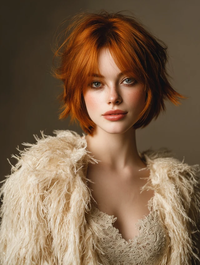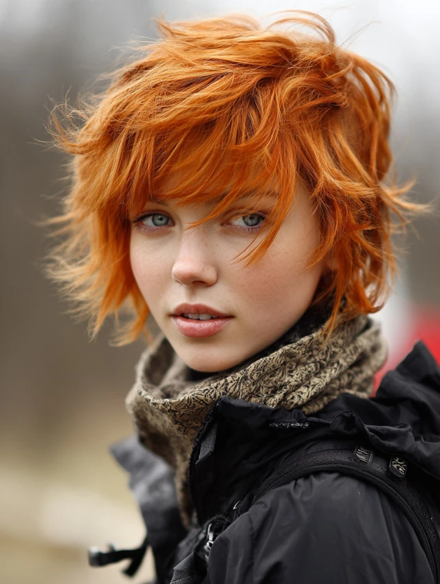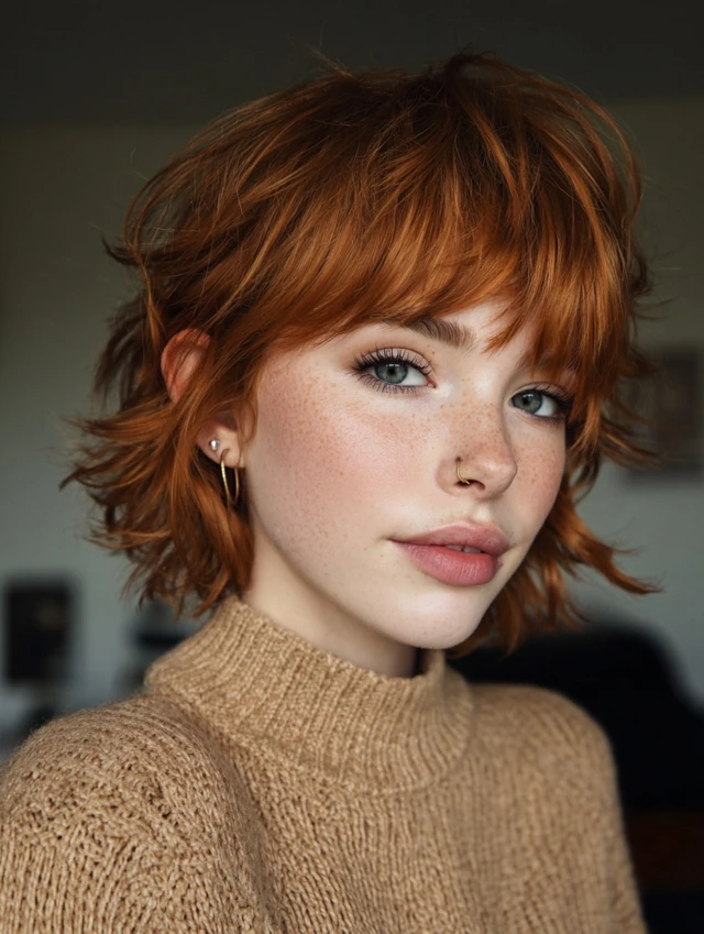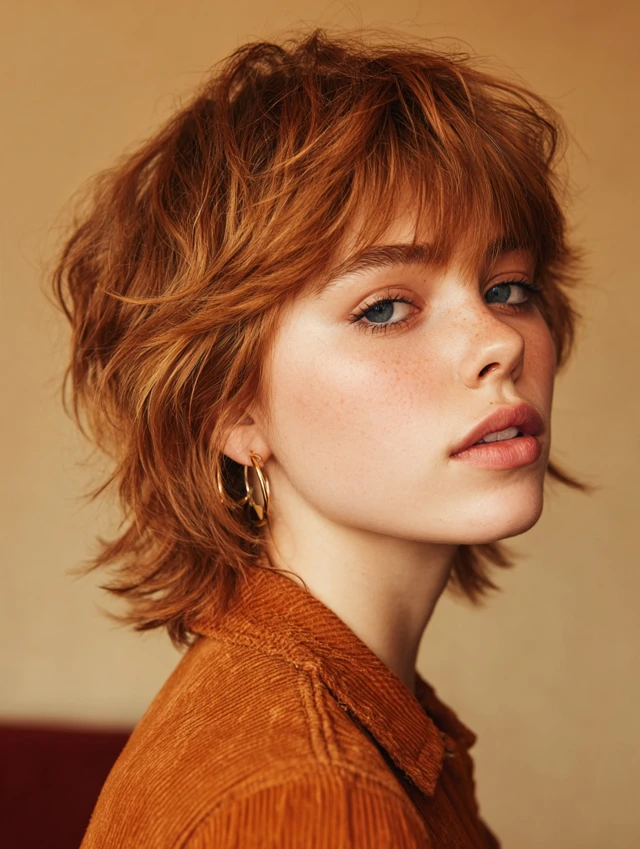A short ginger wolf cut stacks airy layers at the crown and tapers neatly at the nape. Wispy bangs frame the forehead lightly, while the copper shade highlights the texture.