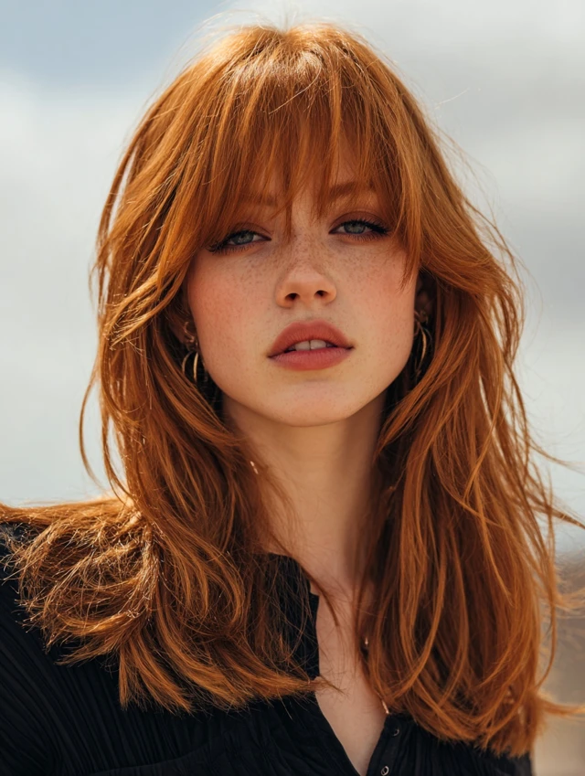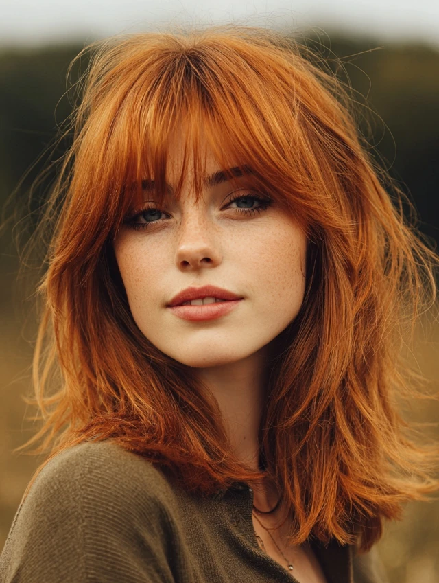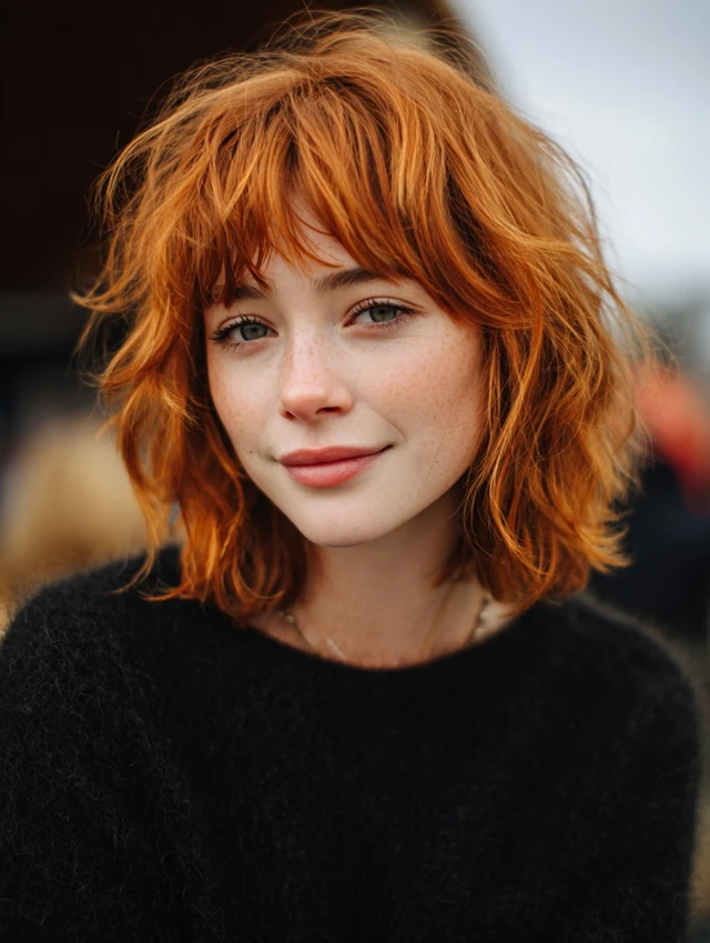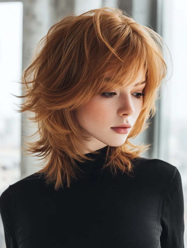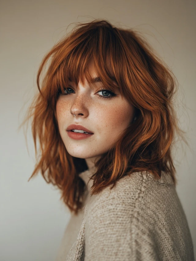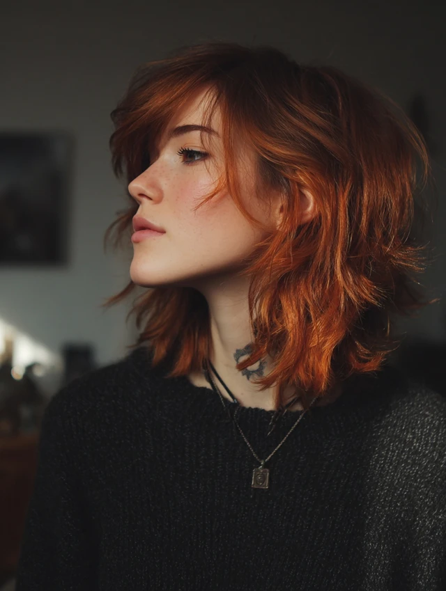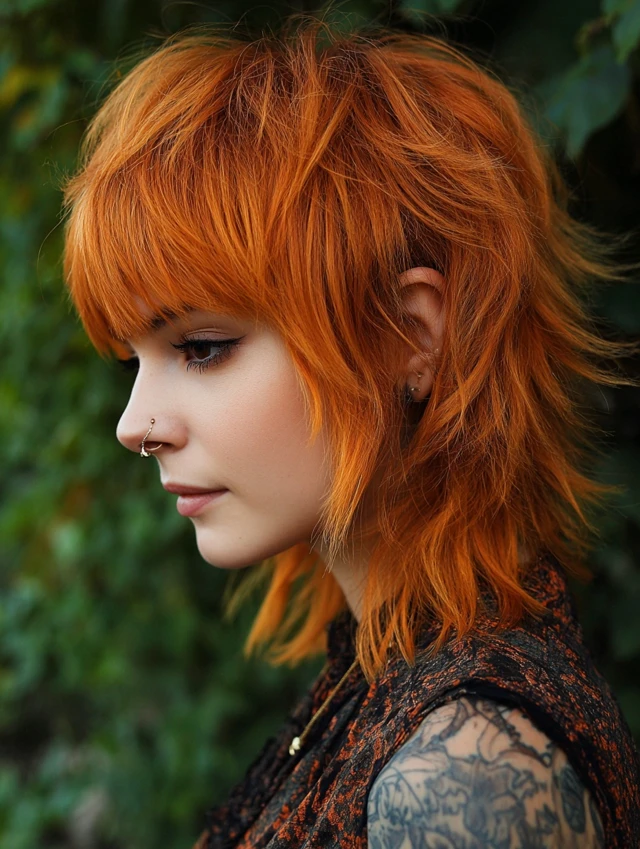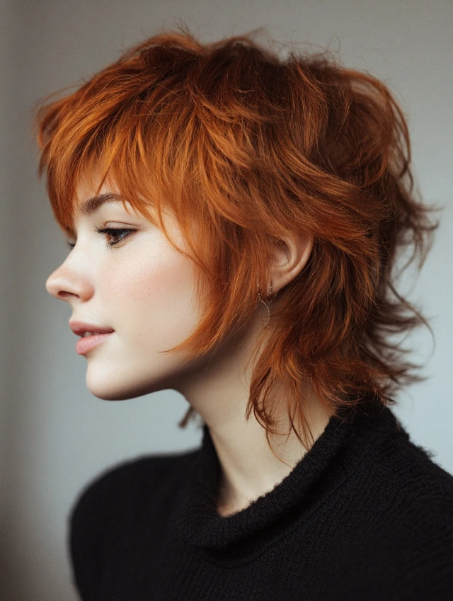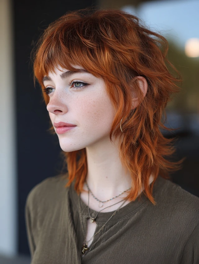 A shaggy ginger wolf cut leans into broken layers and textured ends. Choppy fringe adds attitude without blocking the eyes. The layered crown keeps height, and the fiery tone enhances depth.