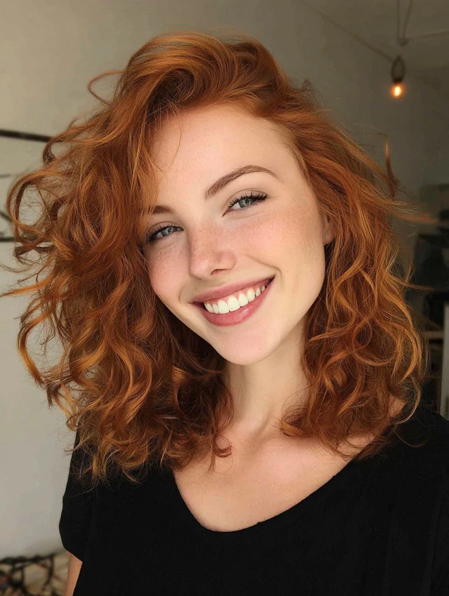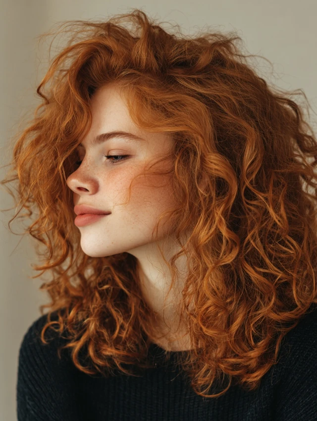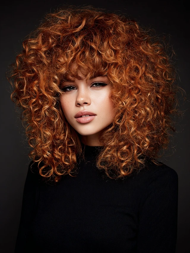 A curly ginger wolf cut shapes volume through rounded crown layers while keeping the back longer and fluid. The curls add bounce, and the copper tone makes each coil stand out clearly. The fringe can stay soft or slightly longer for balance.