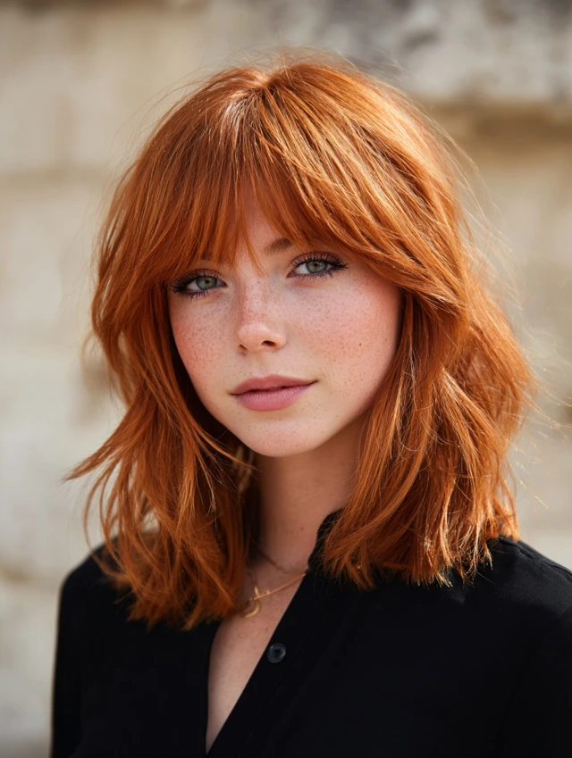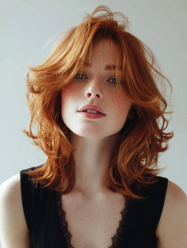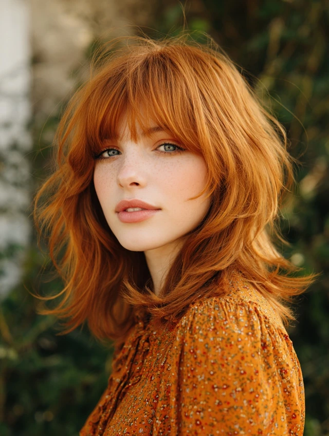 A medium ginger wolf cut keeps length around the shoulders while curtain bangs soften the front. The layered crown adds volume, and the warm tone enhances movement.