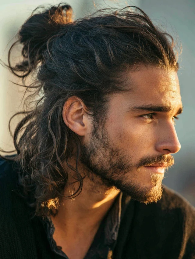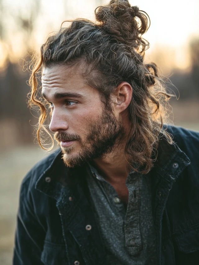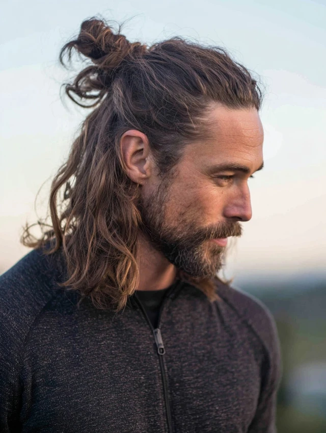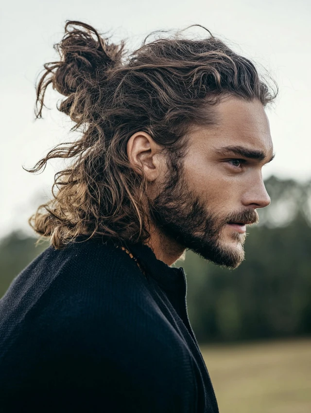 A man bun haircut shapes long hair with light layers so the tied-back look feels neat instead of bulky. Clean edges around the nape and temples stop the bun from appearing sloppy. The loose version still looks balanced when worn down.