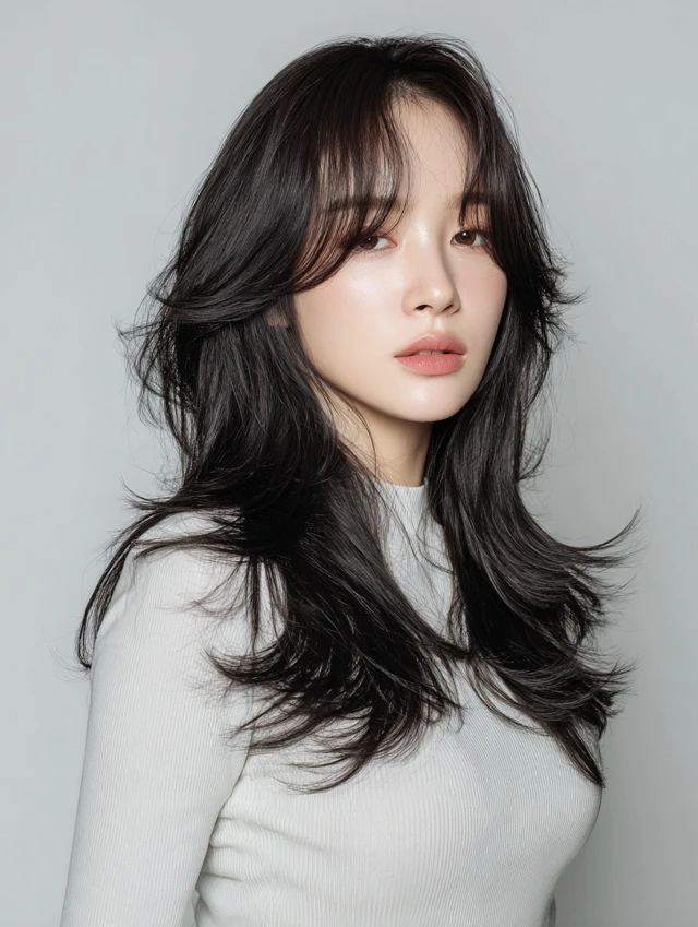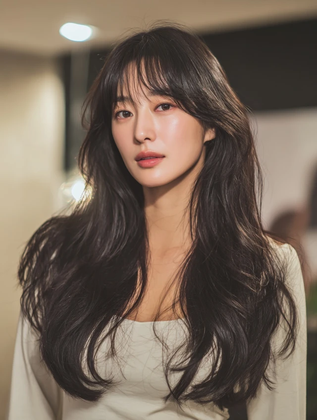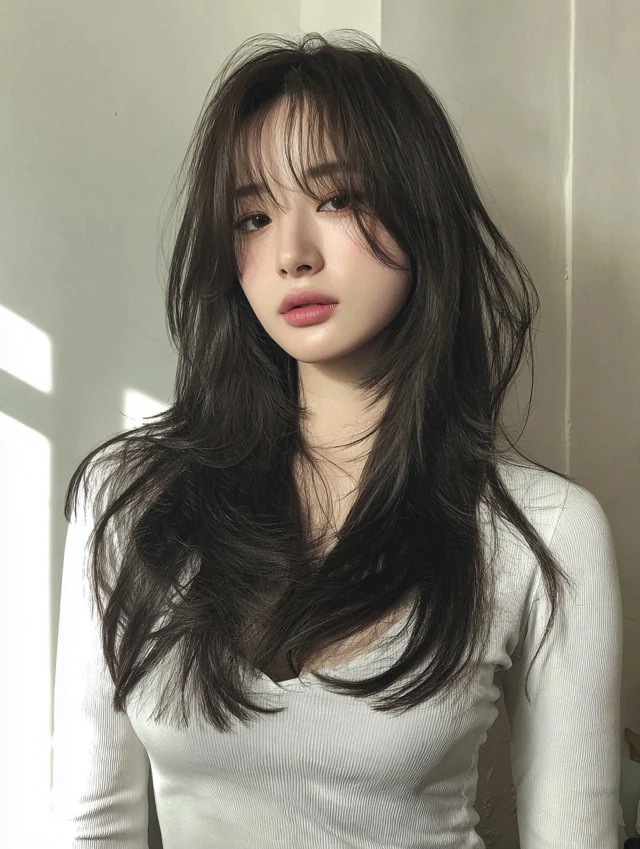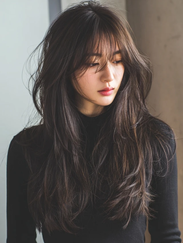 Layered long hair paired with see-through bangs creates softness around the face. The bangs stay wispy and light, while long layers prevent the length from looking flat. The silhouette feels gentle and feminine.