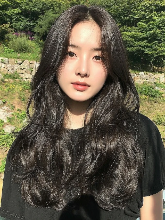 Long Korean waves with a center part focus on soft, flowing bends rather than tight curls. The waves start mid-length, keeping the crown smooth and polished. The middle part balances facial features and creates symmetry.