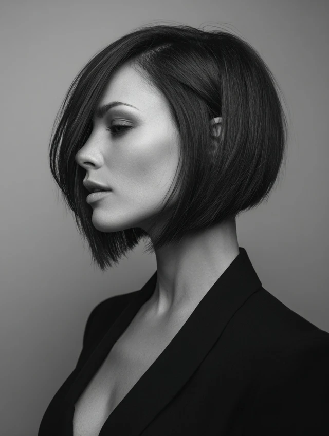 A deep side part shifts volume dramatically across the front, adding lift and drama to the angled silhouette. The asymmetry highlights cheekbones and draws attention toward the eyes. The back stays neat and slightly stacked.