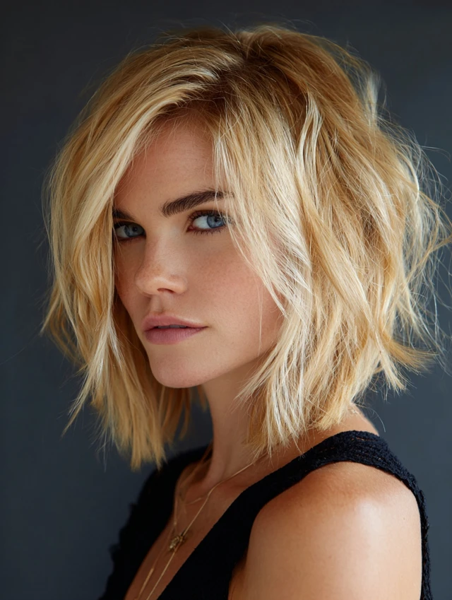 A textured long angled bob relies on broken tips and internal layering to soften the sharp outline. The front still drops forward, but the ends feel airy rather than blunt. Crown texture keeps the cut from looking heavy.