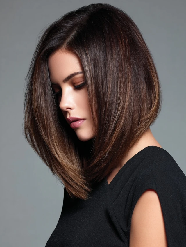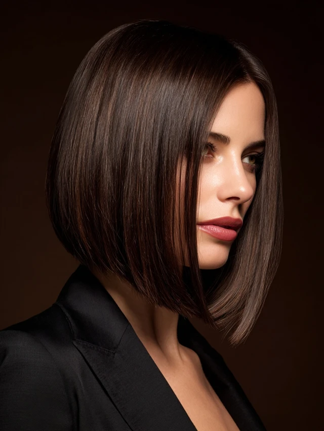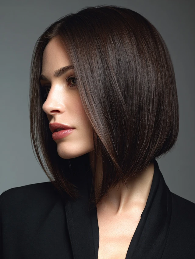 A sleek long angled bob features crisp edges and a dramatic length drop from back to front. The clean line makes the shape stand out instantly, especially when hair sits smooth and glossy. Minimal layering keeps the silhouette controlled.