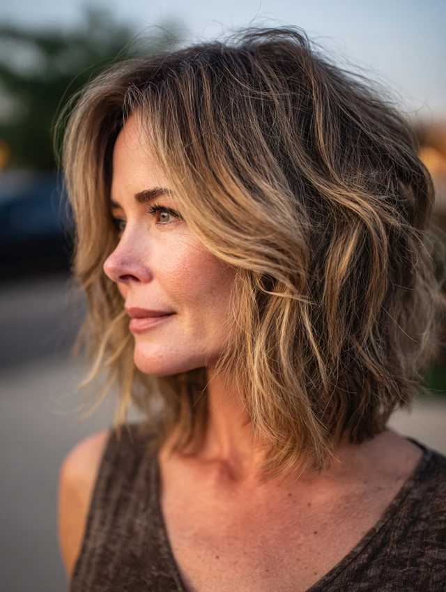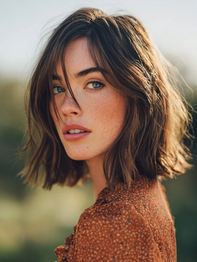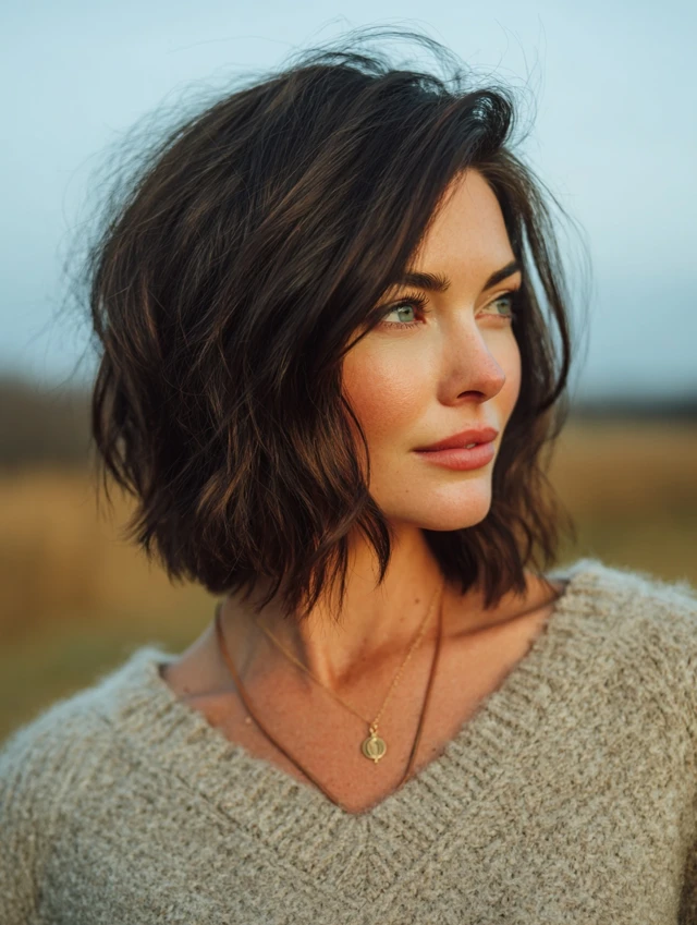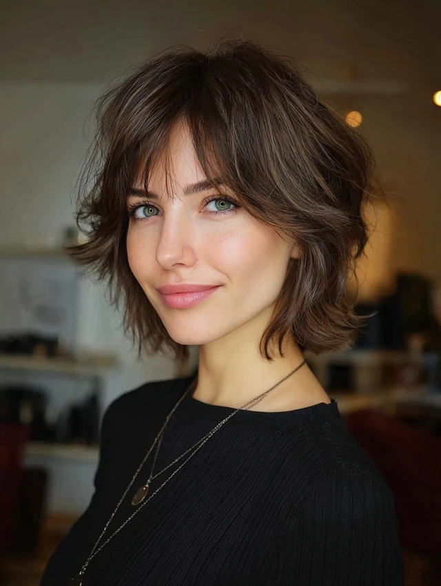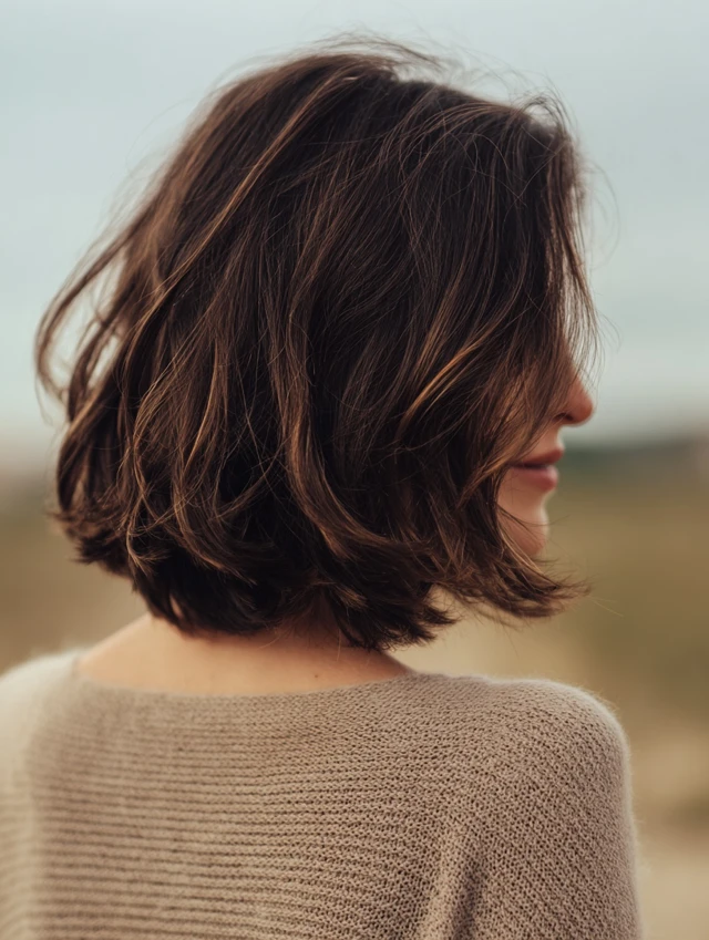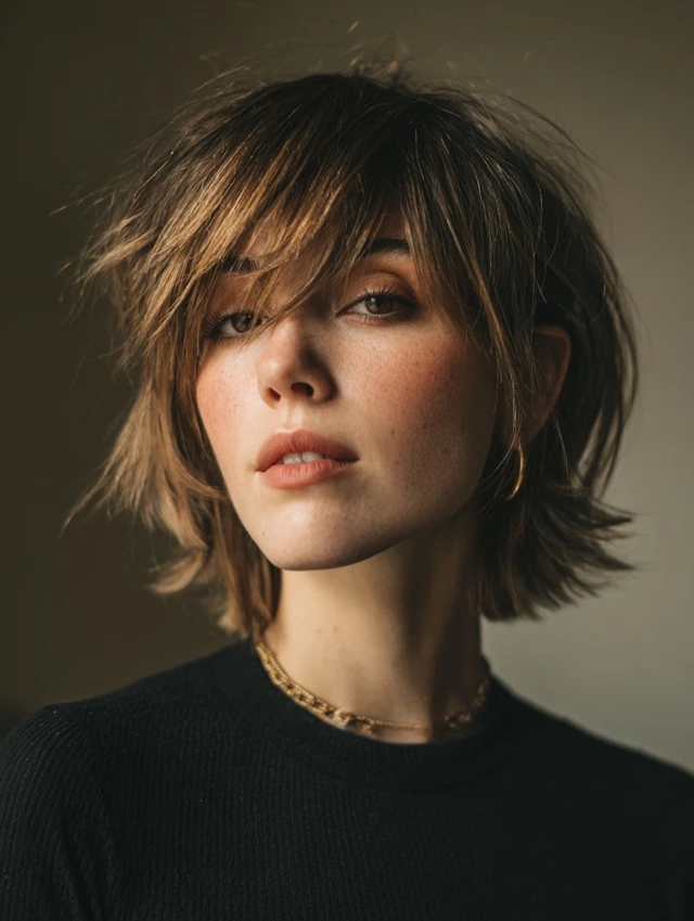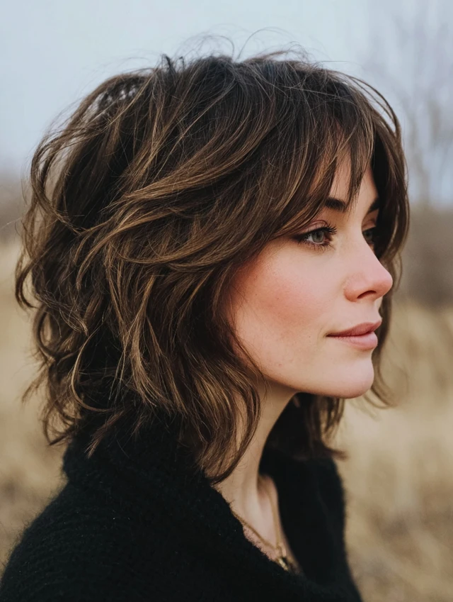 A modern shaggy bob introduces light crown layers and textured ends for lift. The shape feels airy instead of boxy. Subtle movement keeps the cut youthful and current.