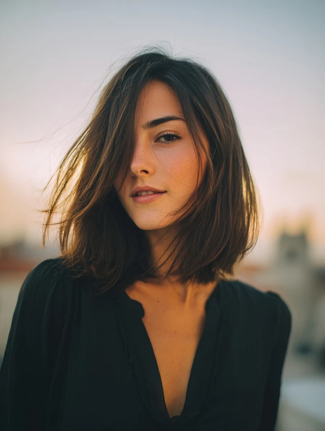 A collarbone-length lob keeps enough length for versatility while adding soft layers for movement. The ends stay slightly feathered instead of blunt, which prevents heaviness. Light face-framing pieces brighten the cheeks and soften strong angles.