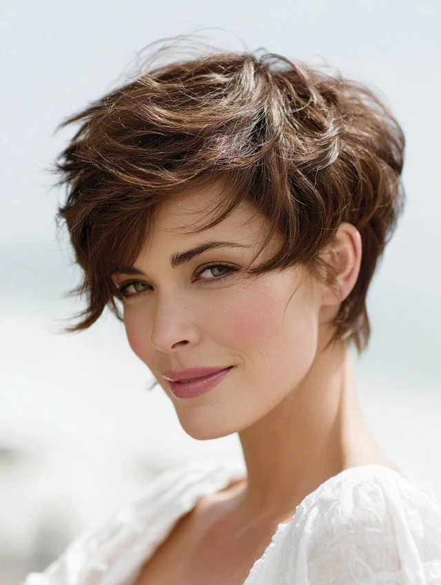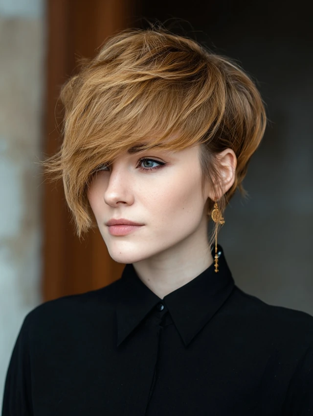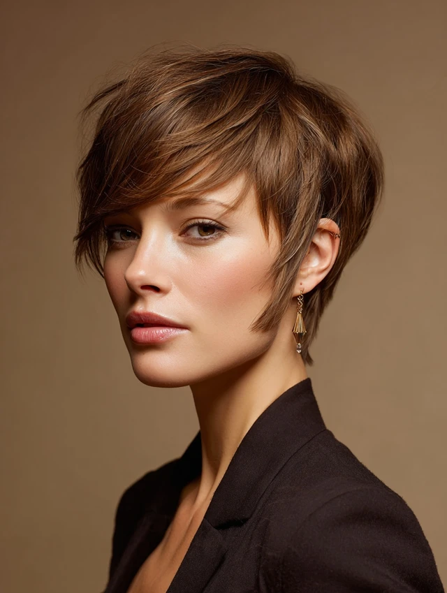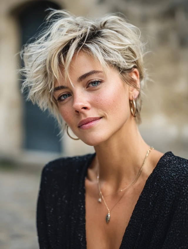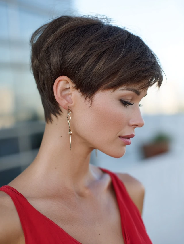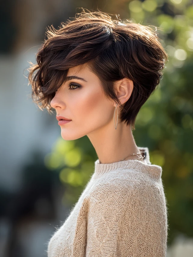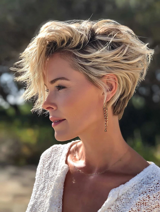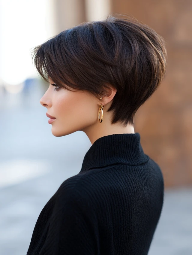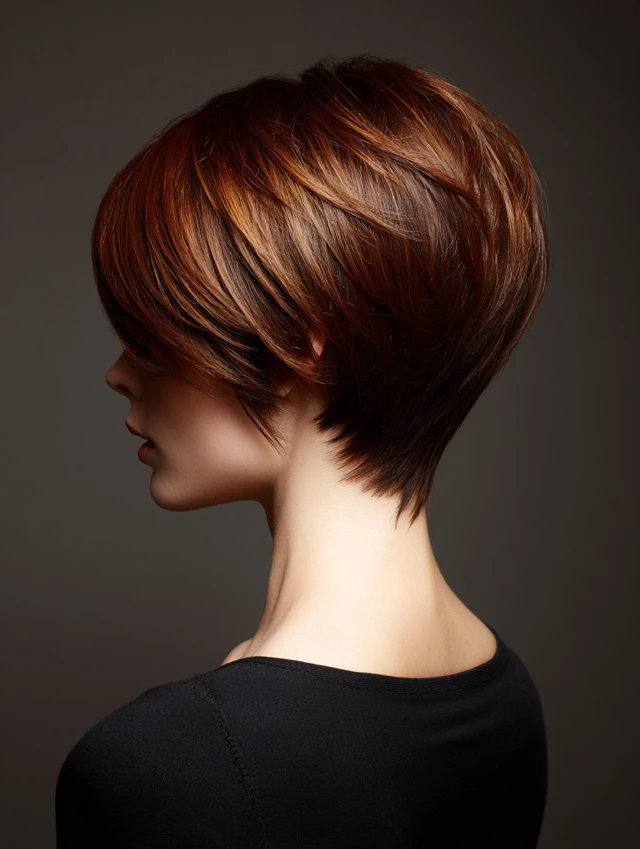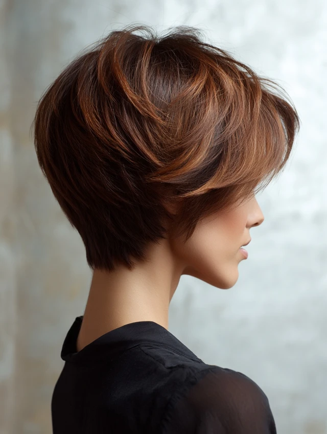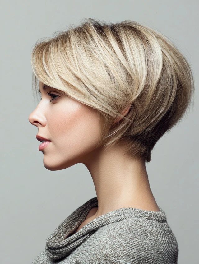 A short stacked wedge haircut succeeds because the layered back pushes hair upward. This creates natural lift without heavy teasing. The angled shape prevents the cut from looking flat or boxy.