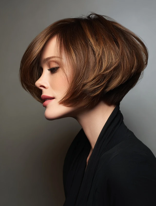 A curved stacked wedge bob rounds slightly at the back instead of forming a sharp angle. The layers build height near the crown, while the front curves gently inward to frame the face.