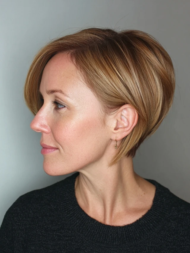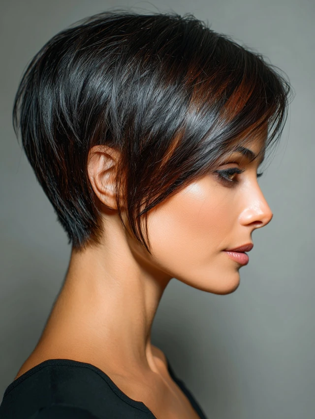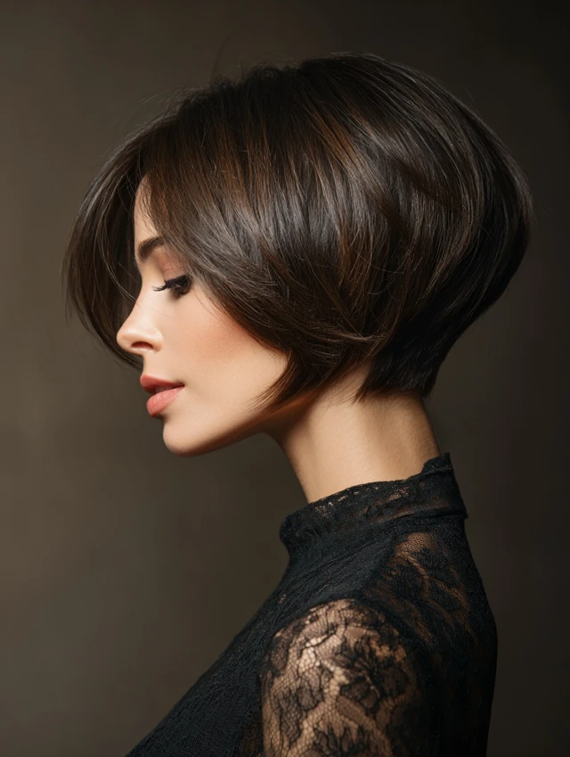 Ask for defined stacking at the back but balanced length in the front. Keep the neckline trimmed regularly to maintain structure. Blow-dry the crown upward for lift and smooth the sides lightly. Avoid heavy products that flatten the layers. Trim every few weeks so the wedge angle stays clean and precise.