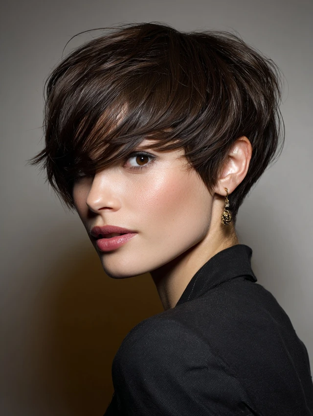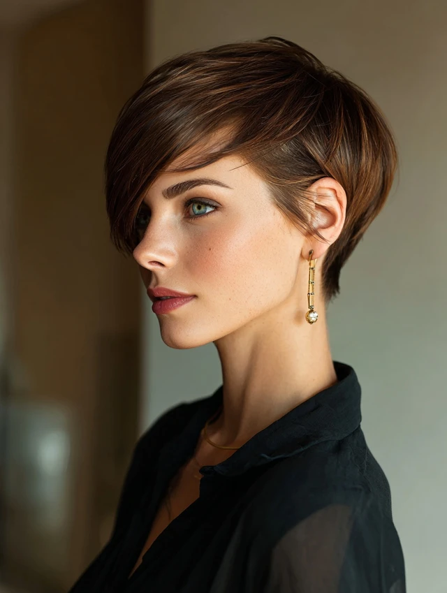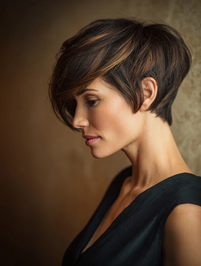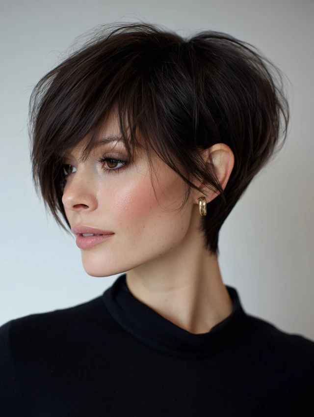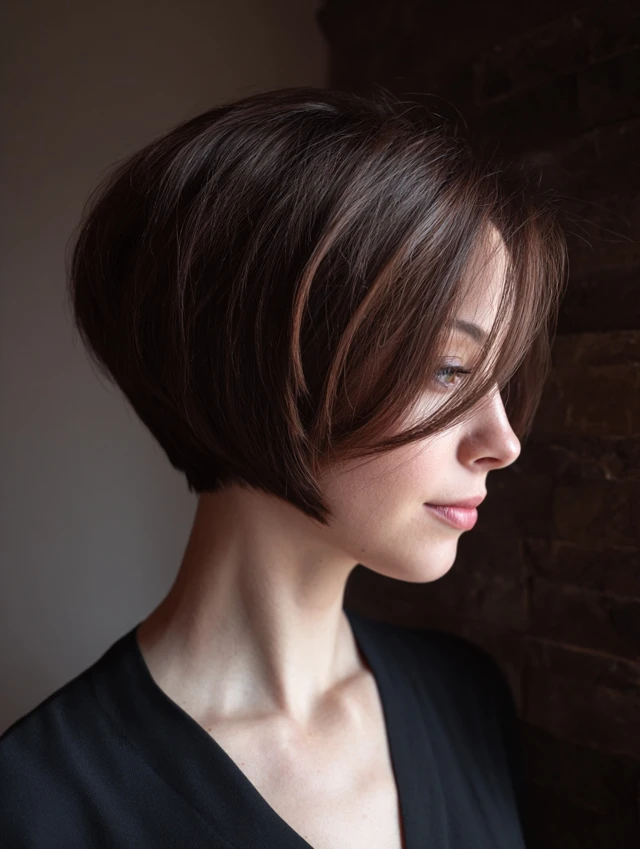 Adding a side-swept fringe to a stacked wedge brings softness to the front. The angled fringe frames the eyes while the back stays voluminous and structured.