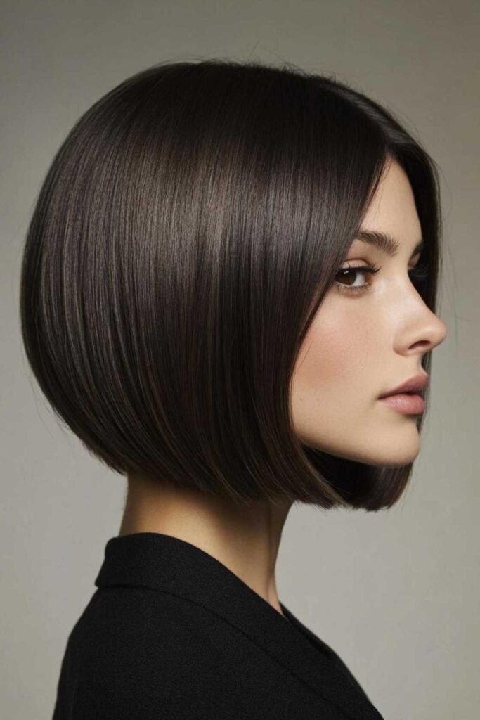This bob is straightened. It looks incredibly smooth. It’s super shiny. It highlights hair health. It looks luxurious and refined. Make sure your hair is prepped. Use a good heat protectant. It’s a high-shine finish. It screams polished elegance.