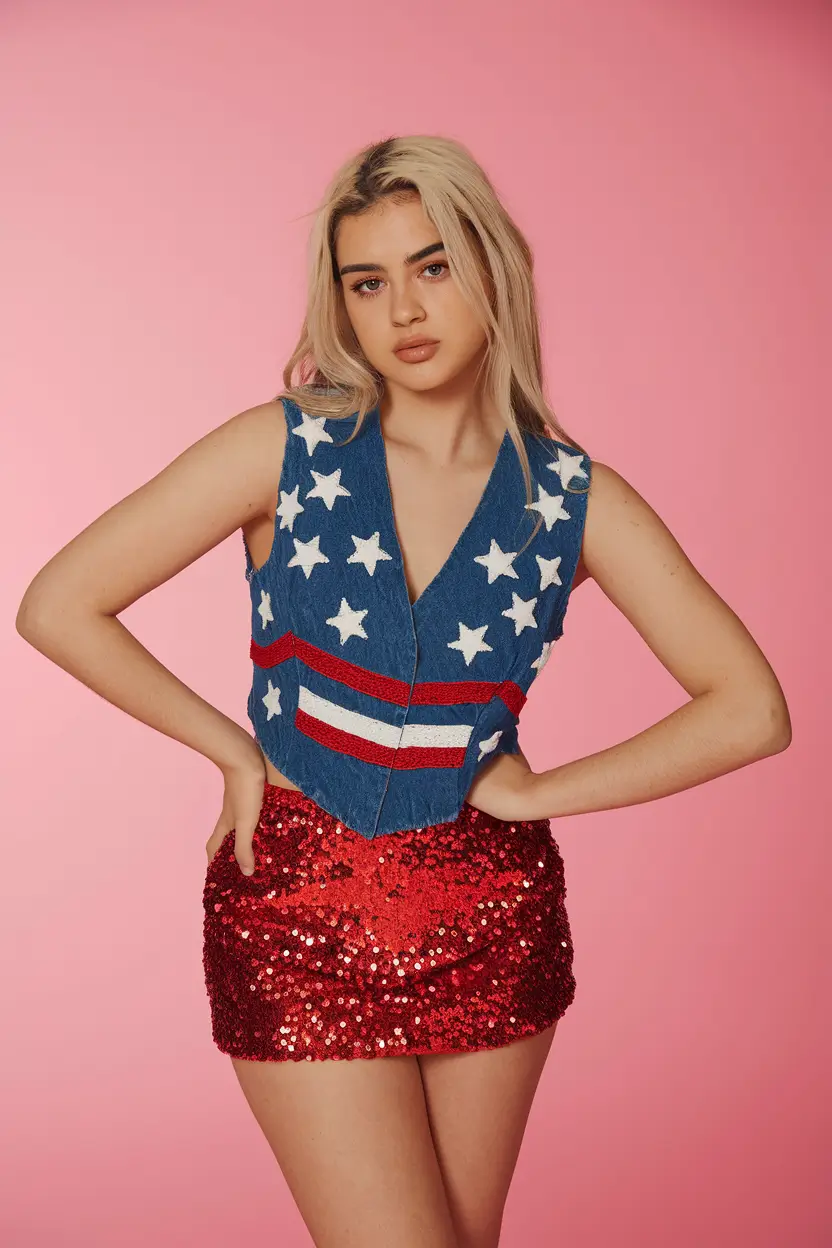 Let’s talk approachable glam. The hairstyle has soft waves and a red, white, and blue headband wrapped around it. It combines that perfect mix of being finished and not quite finished, which is perfect for a simple fourth celebration. You can get ready in five minutes and still appear like you had the outfit planned. She looks like she’s not even trying, which is the aim for most of us.