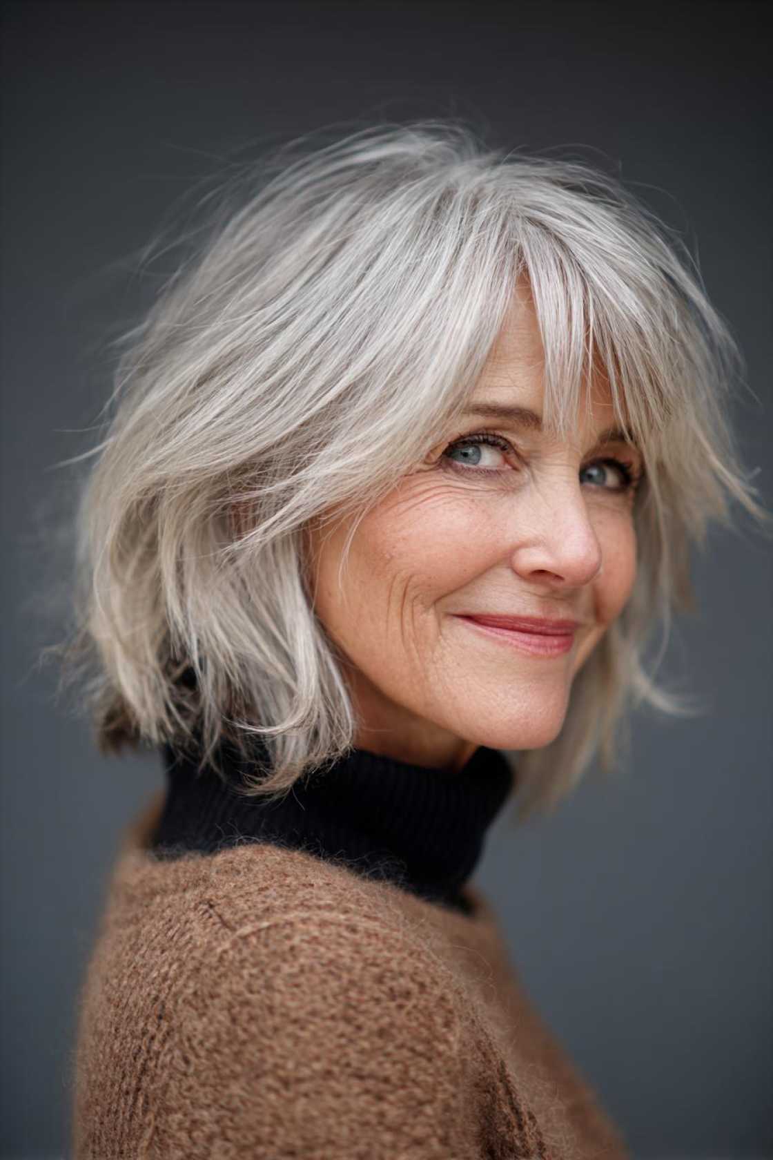 And my top pick! The effortless layered medium cut is all about seamless, well-blended layers that create natural movement and body without looking overly styled. It’s the kind of cut that looks amazing air-dried or styled. It adds just enough volume and shape to feel modern and fresh. This style is my favorite because it’s universally flattering and incredibly easy to maintain. A quick tousle with your fingers and a little bit of light hairspray is often all you need to look put-together. It’s the ultimate low-maintenance, high-impact haircut for over 50.