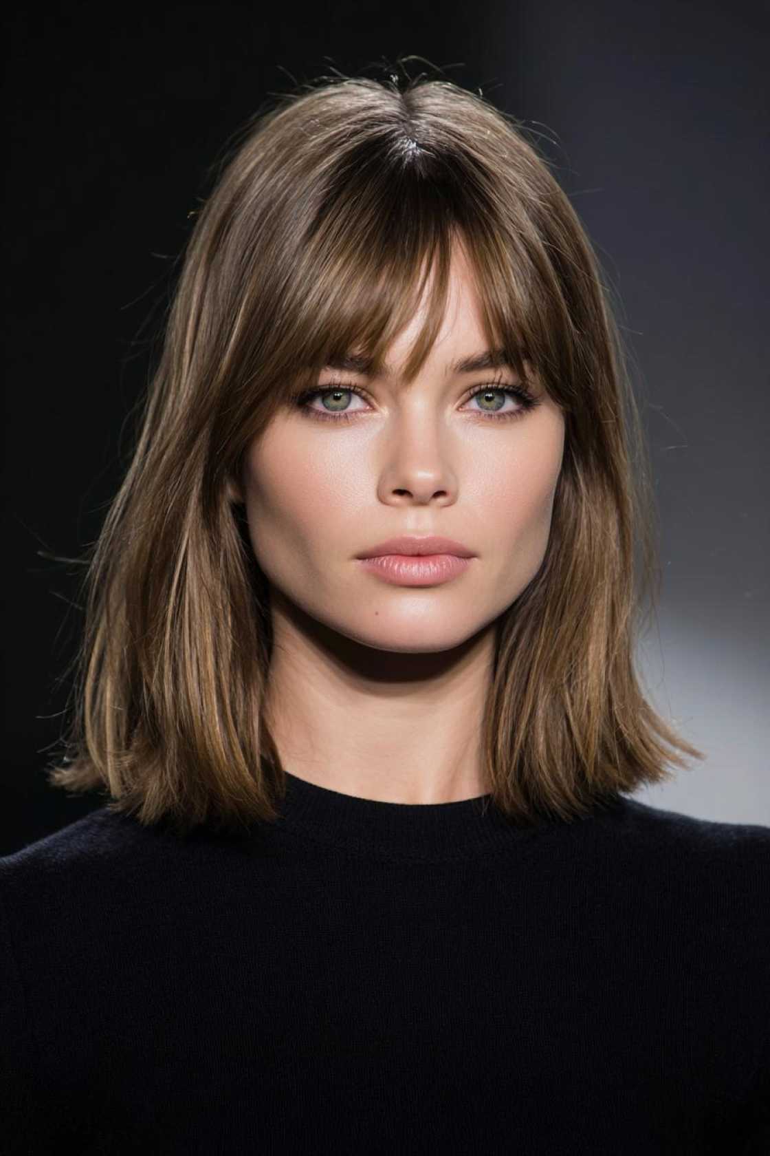 Full bangs fall straight across your forehead. They can be thick or a bit wispy. This cut suits those who aren’t afraid of a bolder fringe. It frames the eyes beautifully. Get regular trims to keep your bangs the right length.
