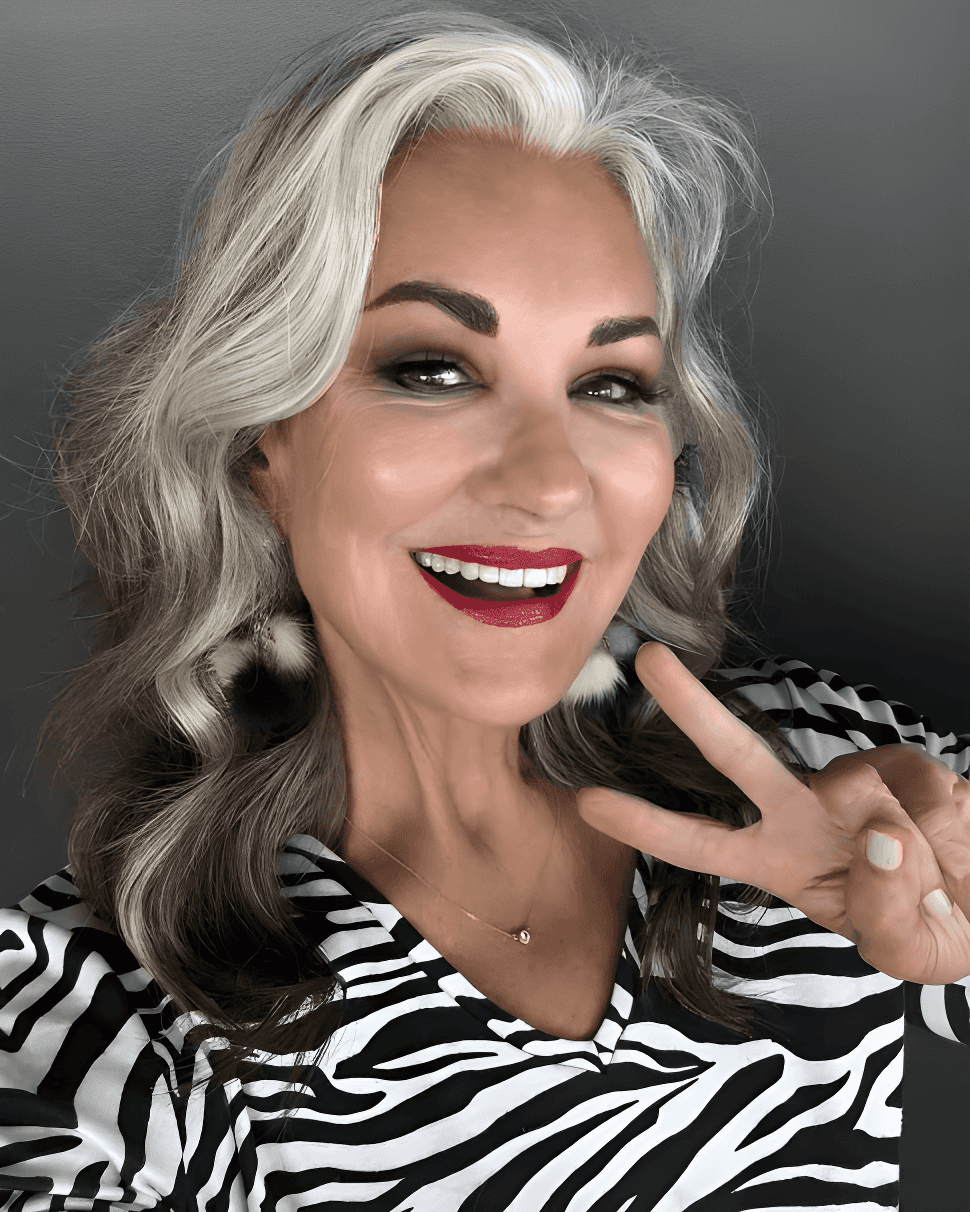 The natural long hair flows with gentle waves, showing off beautiful silver tones throughout. The loose, textured layers create movement and a light, effortless feel that looks both timeless and modern.