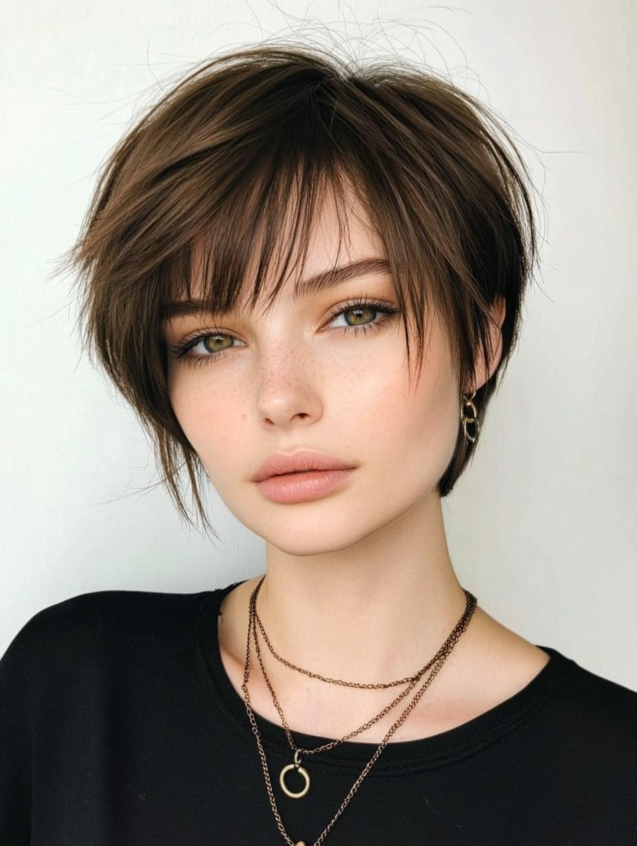 Bobs with fringes are timeless and elegant. Whether it’s a sleek bob with blunt bangs or a more tousled version with wispy, side-swept bangs, this combination is always in style. For short hair lovers, the photos demonstrate how the contrast between the bob and fringe adds sophistication and structure, framing the face perfectly.