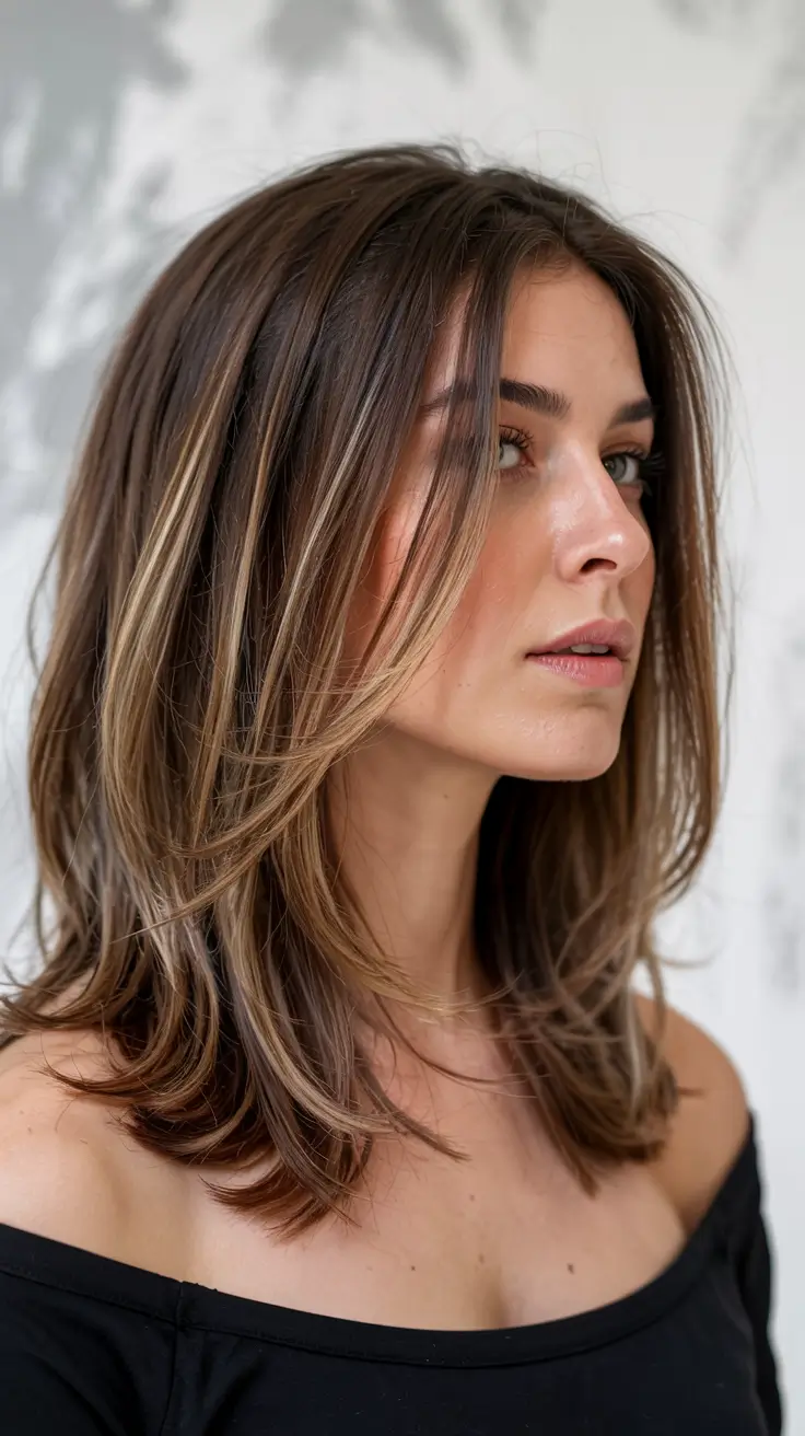 It is always stylish to have mid-length layers that flow like silk and just frame the face enough to appear styled, but not too much. This style is constructed on blended toffee and cool latte strands, not chunky highlights, but airbrushed ribbons that lighten and brighten without screaming. The cut? Seamless face-framing long layers that fall just above the collarbone to create the impression of volume without bulk. It’s the kind of style that works just as beautifully with jeans and sneakers as it does with a turtleneck and red lipstick.
