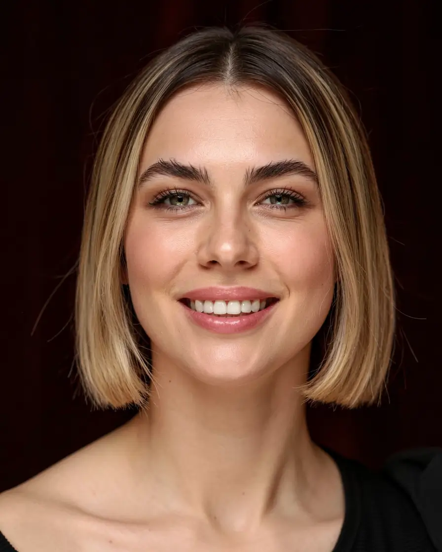 A slick bob with a slight wave and a deep side part has something decidedly classic about it. This version of the fall 2025 haircut on women over 40 years old adds a professional touch to a traditional haircut. The chin length bob is soft and falls just below the cheekbone and gives definition to the jawline without appearing harsh. The curl inward at the ends gives a motion, and the golden beige highlights reflect the autumn light in a silent radiance.