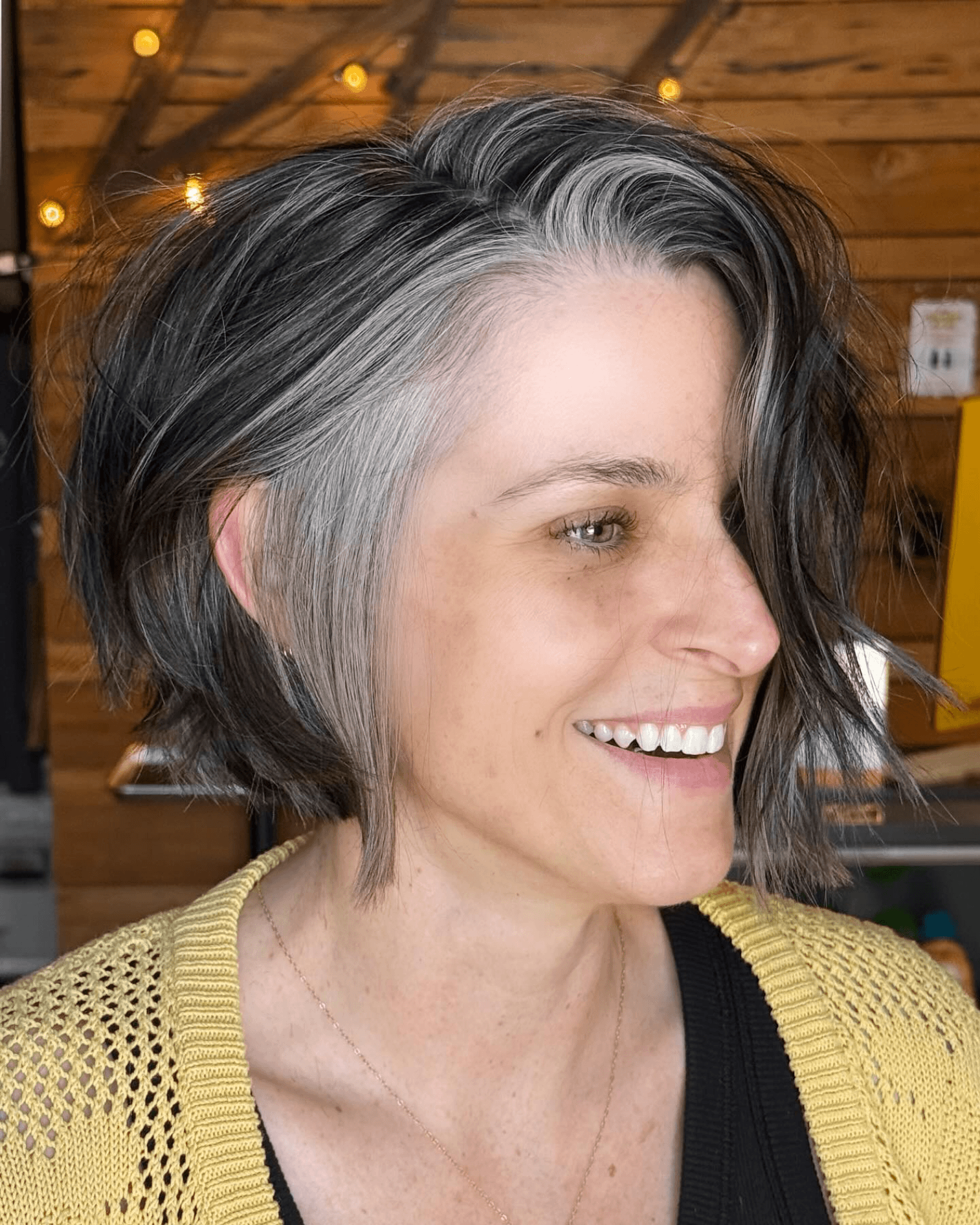 The layered bob combines natural dark hair with subtle grey highlights flowing throughout. Gentle waves create texture and movement, while the natural-looking blend of colors works together beautifully.