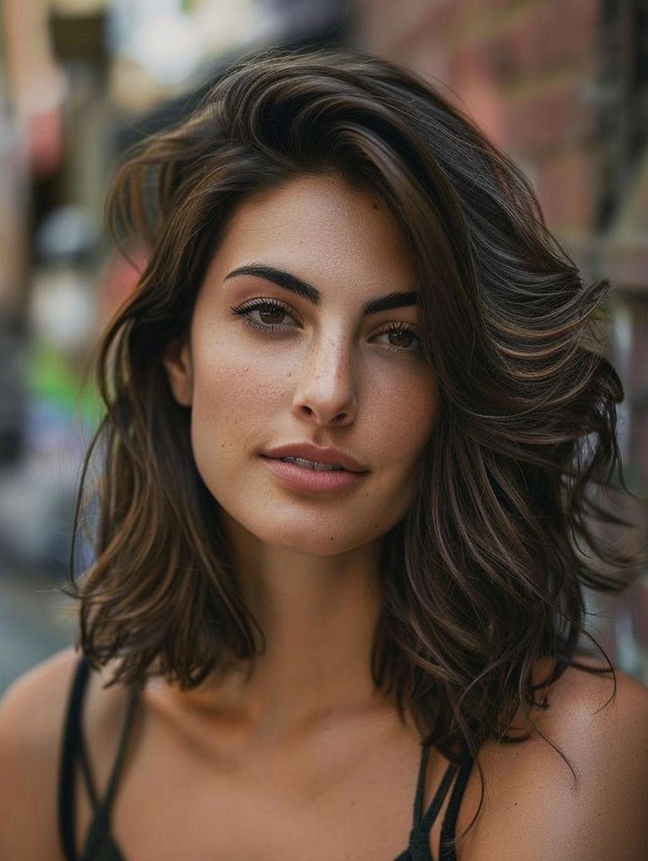 Add flair to your medium hairstyle with wispy bangs and layers. Wispy bangs soften your facial features, while layers enhance your hair’s volume and movement. This style is versatile and can be styled in various ways, from tousled waves to sleek straight looks. Explore different variations on Pinterest for styling ideas.