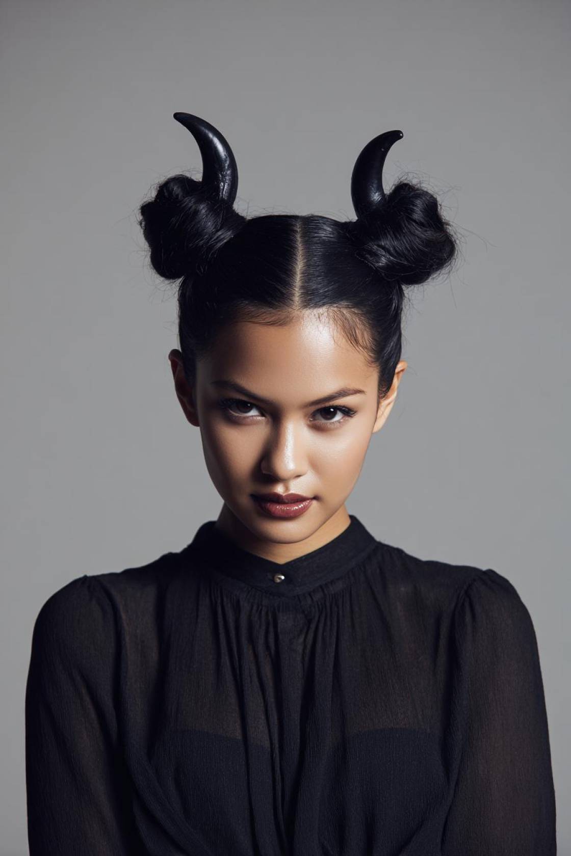 Style two high buns to look like horns. This look is playful and edgy. It works for all ages. Secure your buns tightly. Use hair ties and bobby pins. This ensures they hold their mischievous shape.