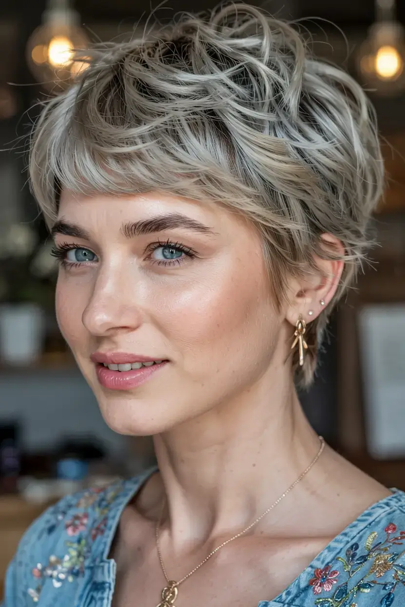 Cute, curvy and edgy, this platinum pixie injects a young vibe with its airy texture and light form. The fringe is feathered and light, and lends motion without weight. It has a casual feel to it that makes it one of the most adaptable fall haircuts ideas 2025 that women over 60 will find it easy to incorporate into their lives, particularly those who will take shorter lengths with grace.