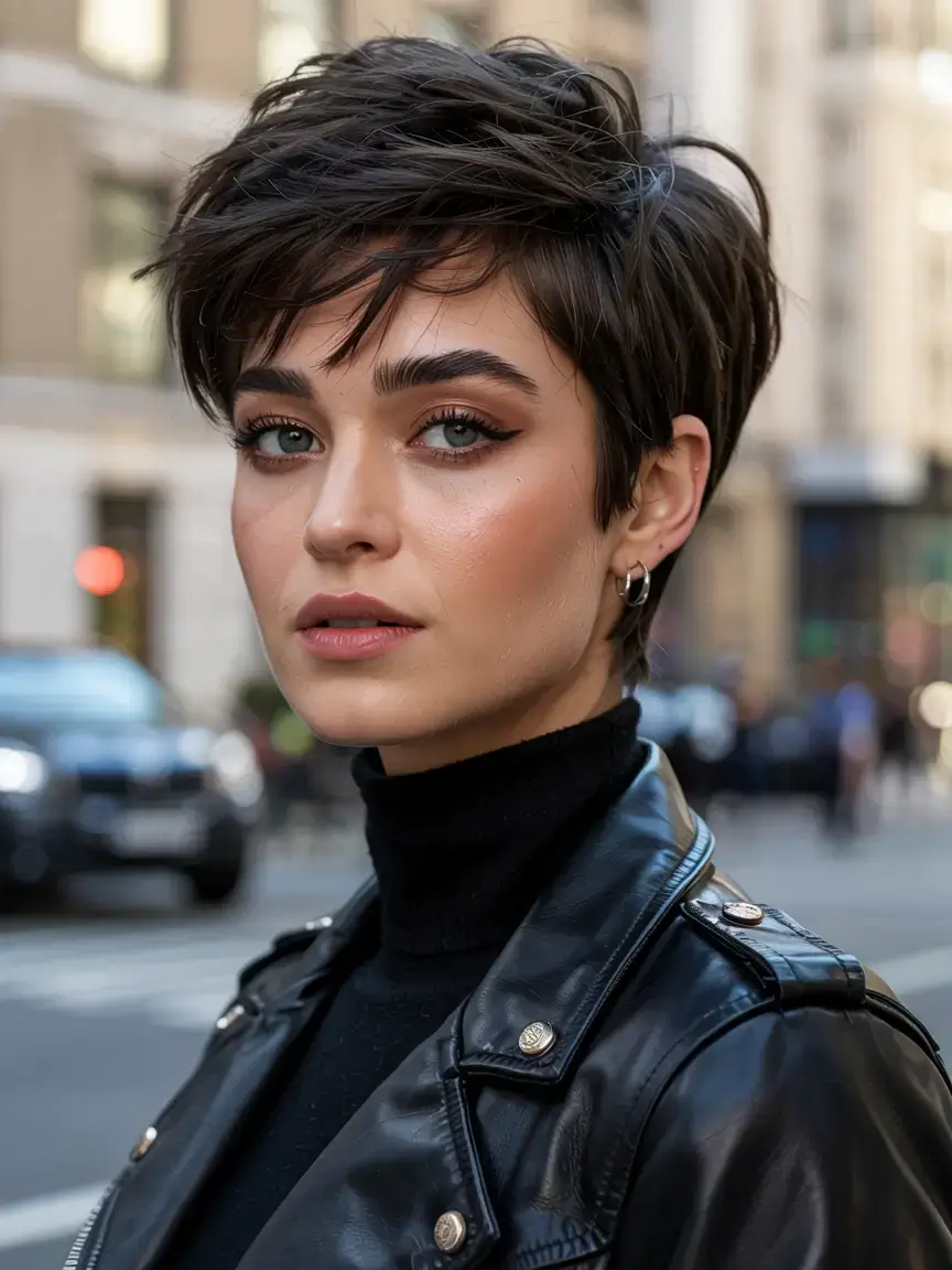 Clean, traditional, and only slightly refined, this style is what a soft pixie is all about. It is well layered through the crown and sides and has fine texture so that it does not feel flat. The medium chestnut tone is flattering for nearly every skin tone and has that “ready-for-anything” vibe that works in both casual and professional settings.