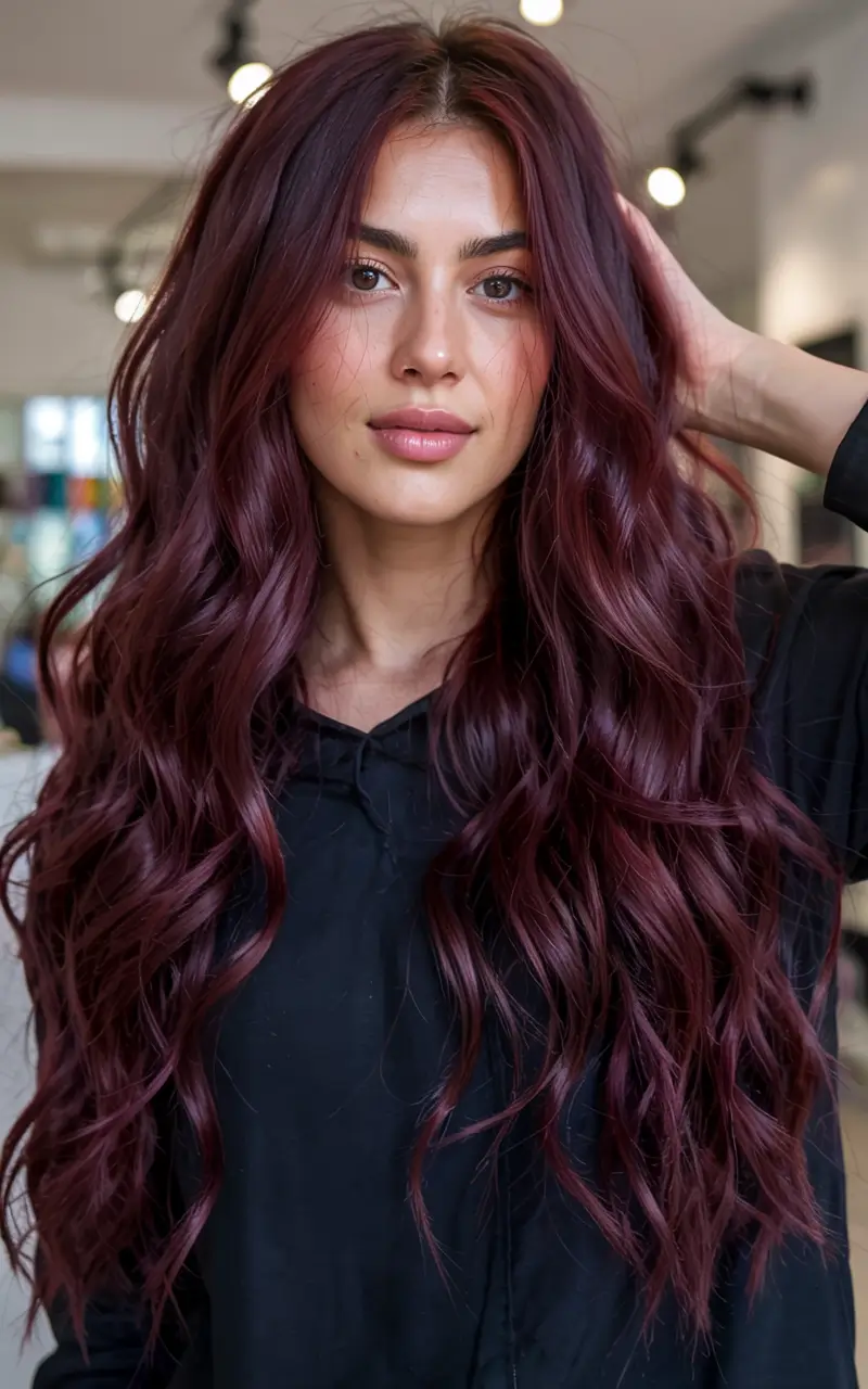 Ending strong with this cool-toned showstopper. This color is nearly violet in undertone – a rich velvet burgundy that is intense and contrasting but not overpowering. It is long and flowing, and the light is caught in the most lovely manner, particularly in warm indoor light. This is one of the most trendy burgundy autumn fall hair colors ideas 2025, and it seems like it is ready to be photographed (or on a date, or on a rooftop, or… you know the rest).
