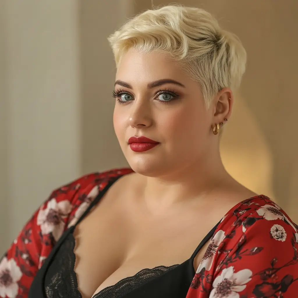 Let’s go full power. This platinum shaved cut with just a bit of buzz is an entire mood: audacious, elegant, and unexpectedly feminine because of a sharp brow and a dewy skin. It is short without being military and the fade at the ears and at the neckline makes it to have a sculpted appearance that can completely change your image.