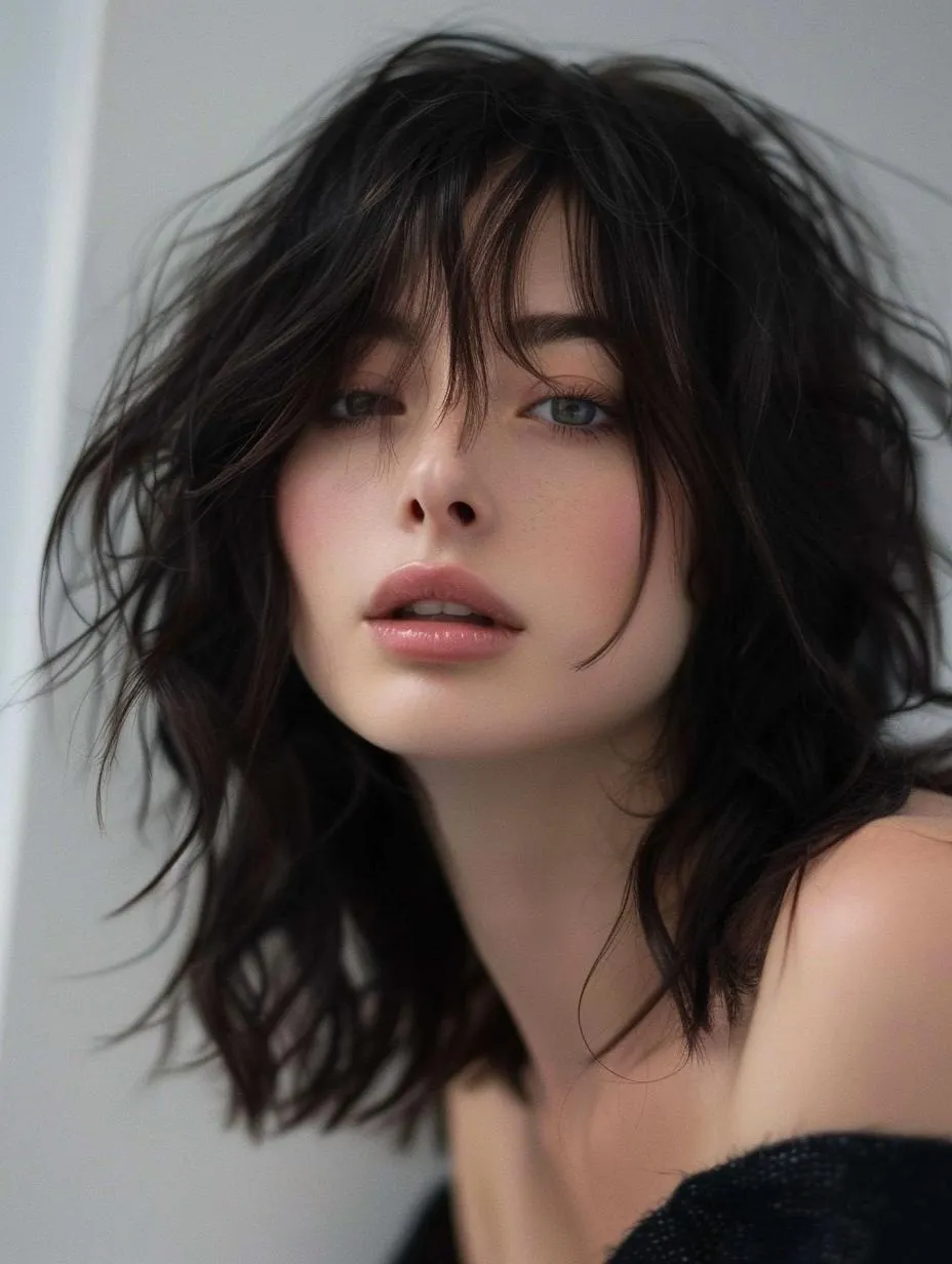 This stunning photo showcases a model with beautifully tousled waves complemented by soft, wispy bangs, creating a perfect balance between playful and sophisticated. The rich, dark hair adds depth and dimension, making it a versatile choice for various face shapes. This haircut is ideal for women looking to add a touch of youthful energy to their style while maintaining an elegant vibe. If you’re considering this look, remember that the key to achieving it lies in texture; using a sea salt spray can enhance those effortless waves. Embrace this trendy cut to elevate your everyday look!