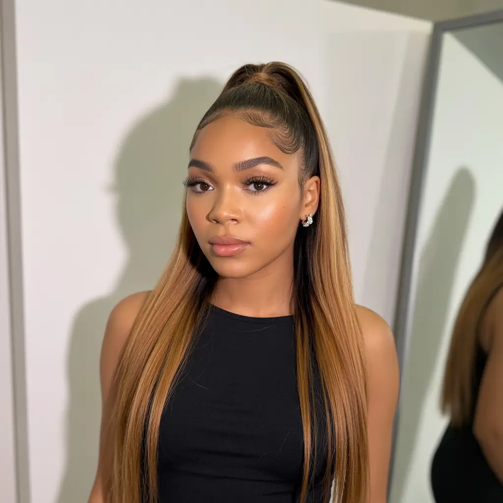 Caramel-filled, high and slick attitude ponytail – this is the one that is all power. The shade of the hair is changed to a dark brown base to a shiny caramel-blonde finish and it gives this mirrored appearance that adores all the light. It is putting winter in a golden spin.