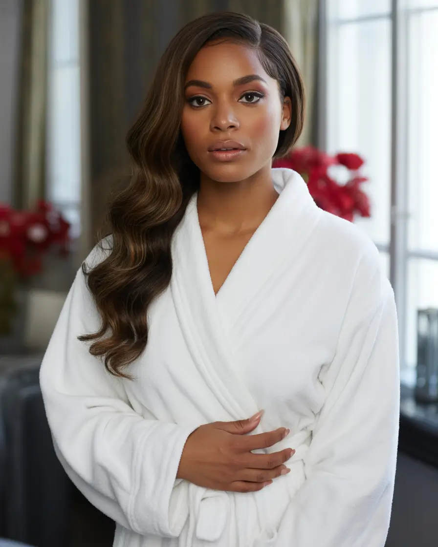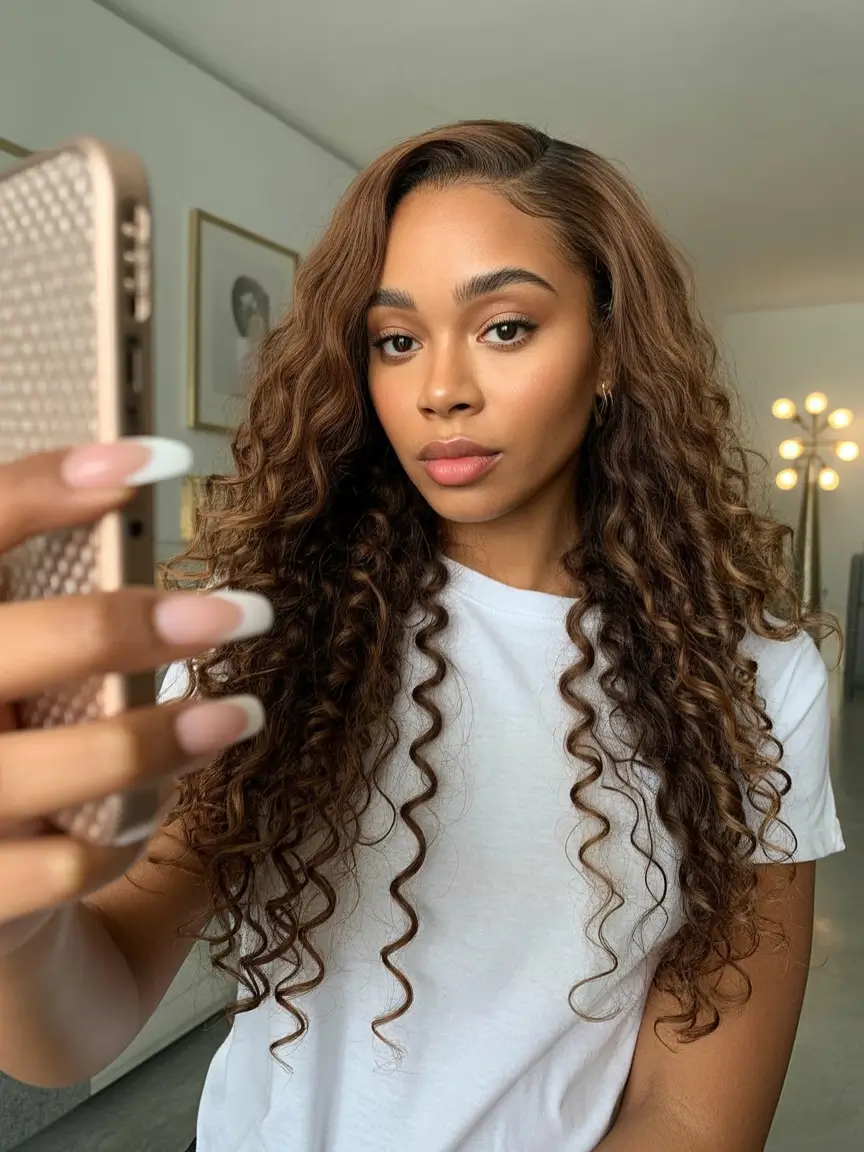 Chestnut velvet is that sort of a color that makes you think of winter mornings that are spent in cashmere and candlelight. It is juicy, three-dimensional, and volumetric, -dimed with warm bronze. Those long, convoluted waves contribute to that old Hollywood, meets with the goddess of the modern times, feel that cannot be disregarded.